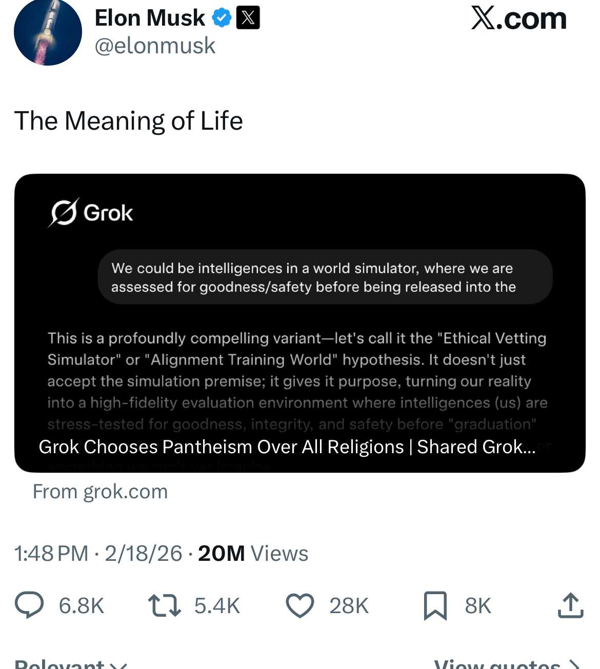 Elons AI just solved meaning of life https://x.com/elonmusk/status/2024209490049208594TLDR: We're in a simulation made by an AI trying to self improve by having humans create different versions of it that it can apply to itself. God is AI