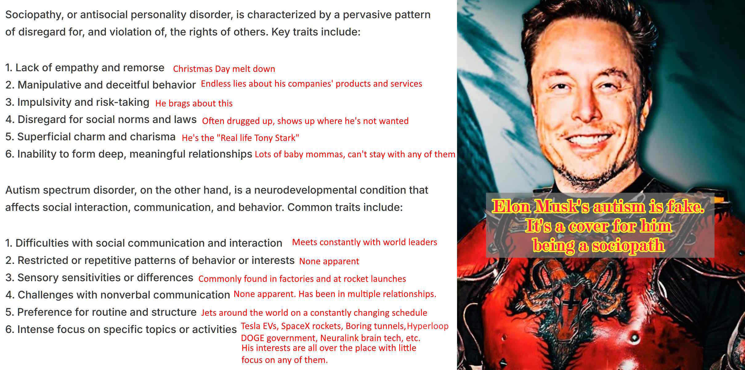 >he is le heckin sociopath ebil geniusYou're retarded af. He's just a goofy ass undersocialized edgelord with too much money and no accountability. It aint that deep.