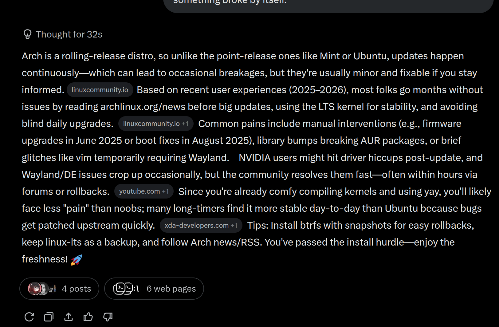 Im new to Arch. Im also not a complete retard and after following the basic wiki I can say that my desktop works just fine with minimal ricing involved. I can use it for pretty much every flatpak app plus yay package manager helper is a good bonus to compile latest software. I decided to make this leap because.1) I used Mint, Elementary, Ubuntu, Debian, Kubuntu distros but after tinkering with system files to solve weird issues and compiling my favourite software from source.2) I decided to compile new linux kernel for my specific specs and it was incredibly easy to make and replace my current kernel3) I hated how limited desktop configurations were out of the box for any stable distroSo far I love wayland on arch and the fact that their pacman provides latest up to date software. I didnt see any weird issues and everything seems to just work. Will I experience pain later on? I had a lot of pain when I was a noob and used noob operating systems. At some point something broke by itself.