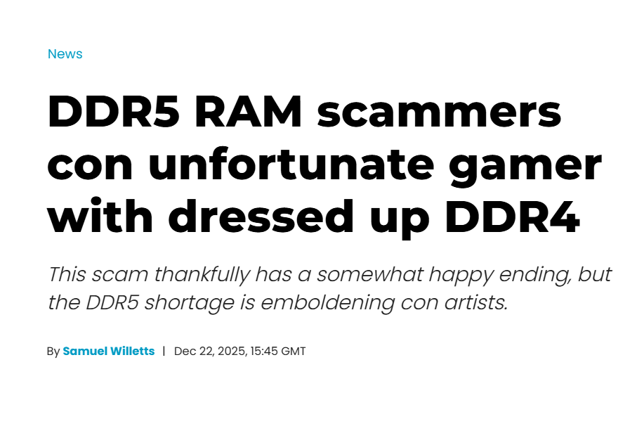 >>108202123>I can't sell my ram... nobody is buying... ive dropped the price constantlyToo many scammers on the market now, normies have caught on and it's scared them off.