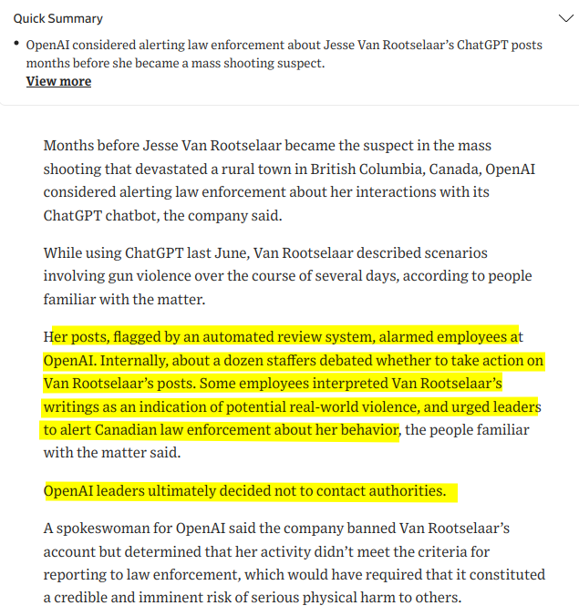 https://www.wsj.com/us-news/law/openai-employees-raised-alarms-about-canada-shooting-suspect-months-ago-b585df62 (https://archive.is/EqNrW)Stay local, anons.