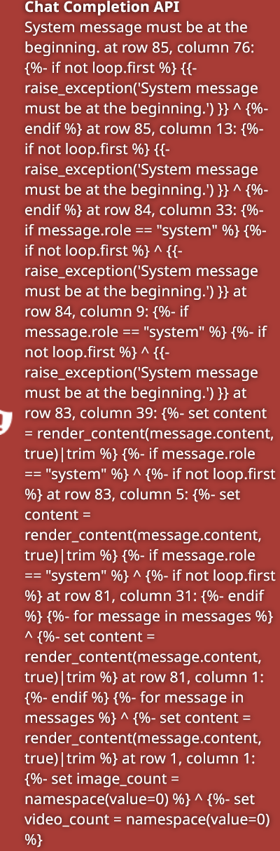 >>108211886Seems like the jinja template is disagreeing with the request object you are sending.