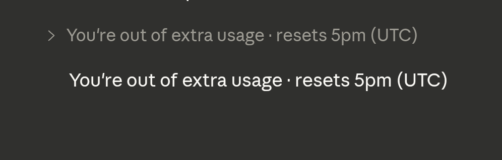 >>108204843I don't recognise that UI, is it Claude desktop?Double check usage on the website. Sometimes Claude Code seems to mistakenly think you're out of extra usage when you aren't, maybe claude desktop has the same bug.But it's billed at API prices so it's terrible value compared to paying for a more expensive subscription.