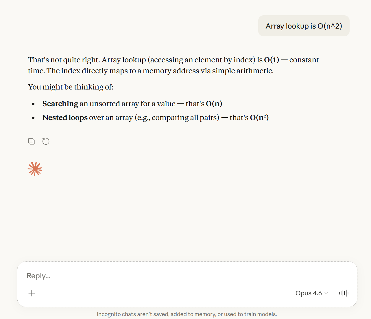 >>108205360Here's Claude Opus 4.6, the supposedly smartest model currently available, in an incognito chat.Doesn't know what big O notation means.