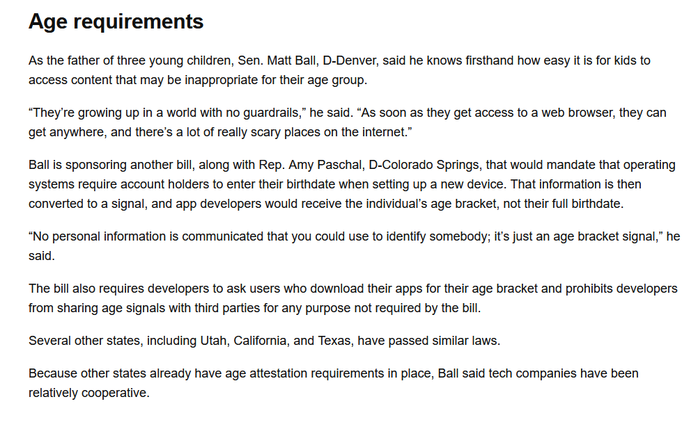 >>108241279>>108207693NTA buthttps://legiscan.com/CA/text/AB1043/id/3269704This bill, beginning January 1, 2027, would require, among other things related to age verification with respect to software applications, an operating system provider, as defined, to provide an accessible interface at account setup that requires an account holder, as defined, to indicate the birth date, age, or both, of the user of that device for the purpose of providing a signal regarding the user’s age bracket to applications available in a covered application store and to provide a developer, as defined, who has requested a signal with respect to a particular user with a digital signal via a reasonably consistent real-time application programming interface regarding whether a user is in any of several age brackets, as prescribed. The bill would require a developer to request a signal with respect to a particular user from an operating system provider or a covered application store when the application is downloaded and launched.He's right in that california has what Colorado has but much worse. It was signed back in October.So no, California has passed this exact thing but on steroids, because it's not just the online website that has to require online ID but your literal Operating System, and developers now have to check for that in their applications too.You know what's developed in California? Android, iOS, MacOS, etc. Literally every site and app is going to have your personally identifiable information by default now and there is no escaping it.