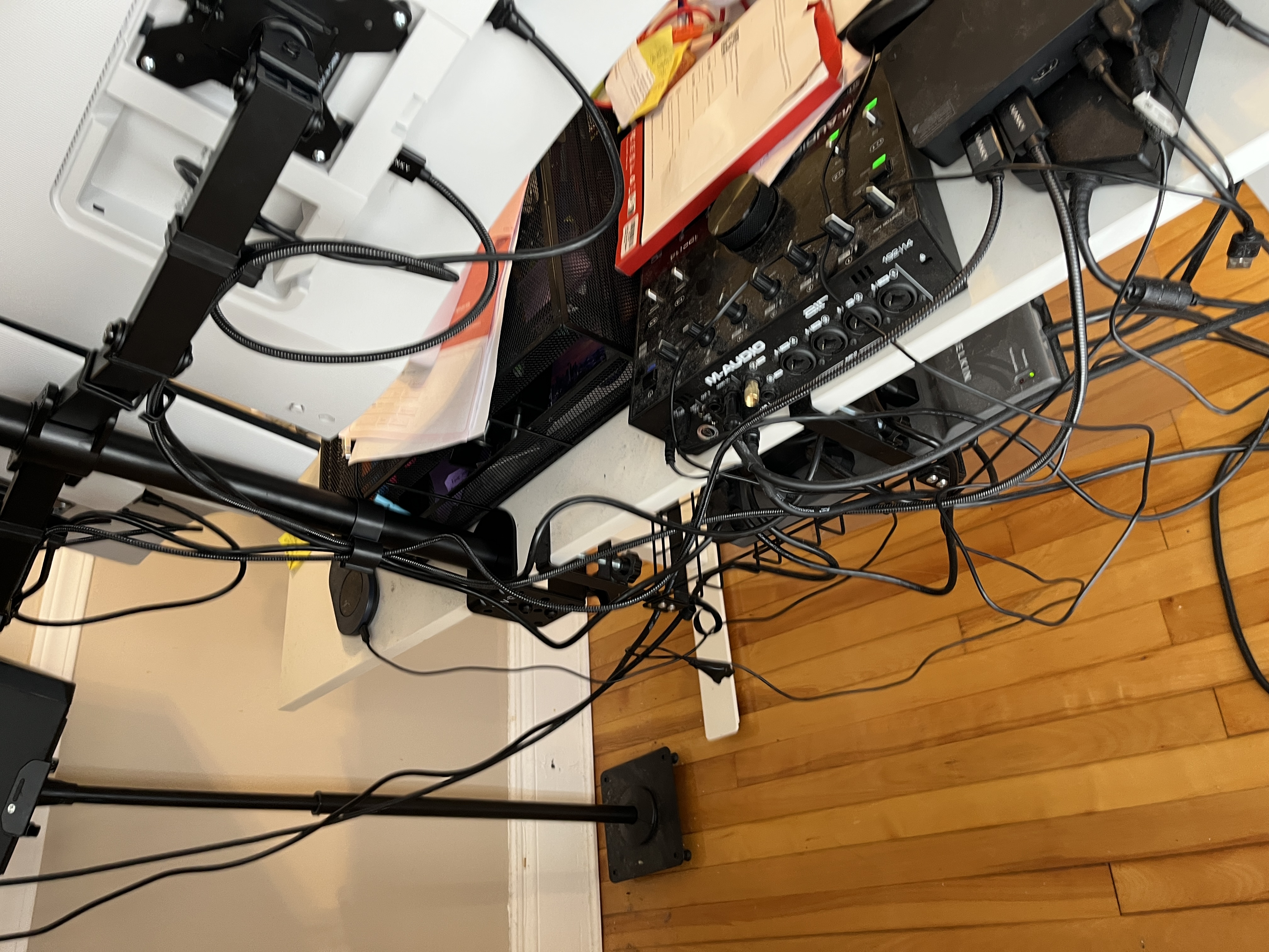 How do I deal with this shit? Looking at it and fighting with these cords make me want to KMS. I think I just have too many cords with my laptop, dock, 2 monitors, audio interface, 2 speakers, USB and lightning cables, mouse jiggler, keyboard and mouse dongles, etc