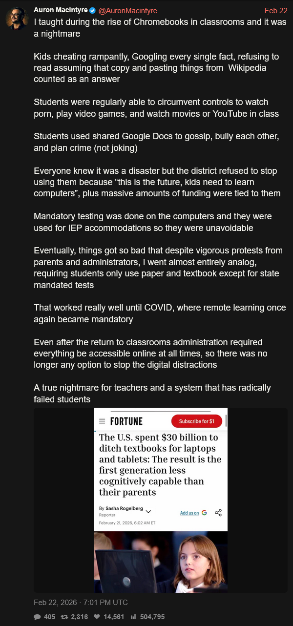 >>108224655>Yes kids watching porn and YouTube in class instead of learning how to read and do math is good>t. retard>>108226041Good thing we gave them computers whose only function is to access the internet with effectively no further capabilities
