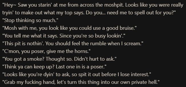 Promptlet wondering how to make dialog with Sonnet/Opus more back-and-forth during lighter scenes? So often its responses are similar to:"[Narration] [Narration] [Narration] [Narration] [Respond to what user said, then ask a question][Narration] [Narration] [Make another comment or question after this without giving user a chance to answer the first thing] [Narration]"