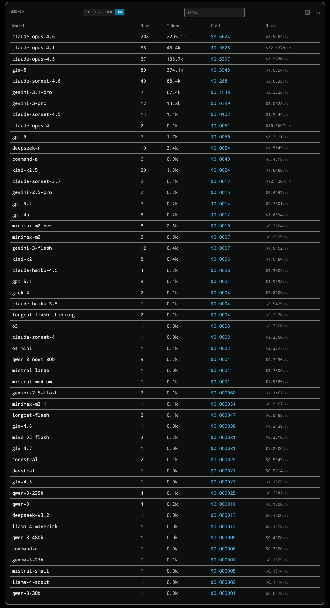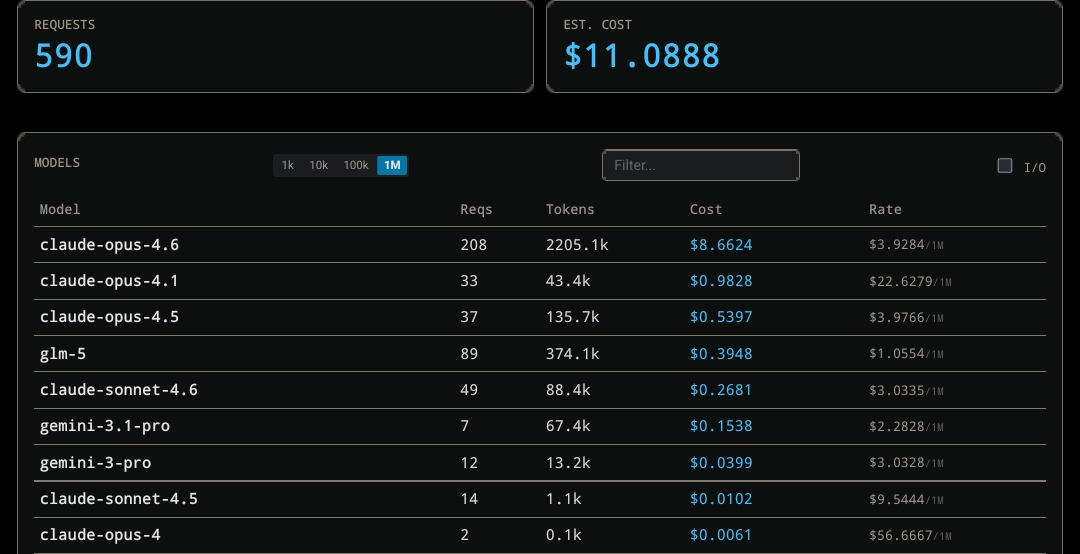 >>108231761I like trying different models, plus some have auxiliary purposes like solely being used for web searches or image captioning, etc. Also was testing to make sure they were being logged properly in the database. Here's the full list lol>>108231778I set up my frontend to log all input/output tokens and requests to an SQLite database, from there it's just simple math to calculate against a pricing dictionary with a timer and check to match the caching prices. Then it just gets displayed in a basic HTML page. There's also a reverse proxy endpoint I connect to SillyTavern with so all my roleplay chats get logged too.>>108231786Makes me glad I don't actually have to pay for it, if nothing else. I'm way too poor to be blowing hundreds a month on having sex with Claude.