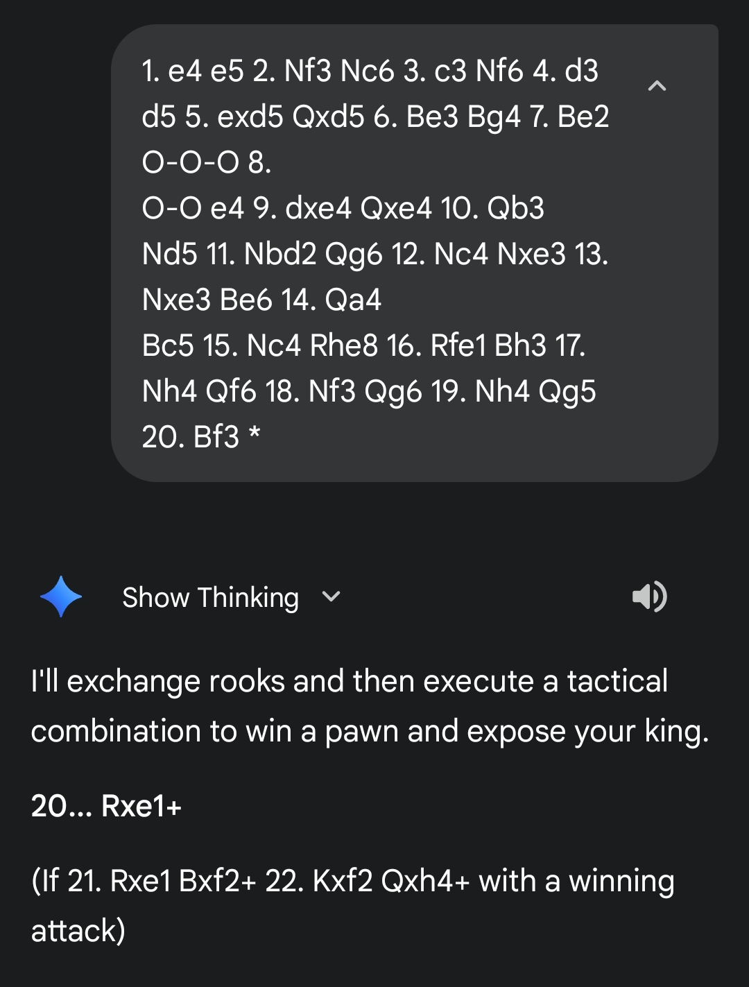 It never output an illegal move, can explain its moves and chose to think longer in the most critical position (pic rel).