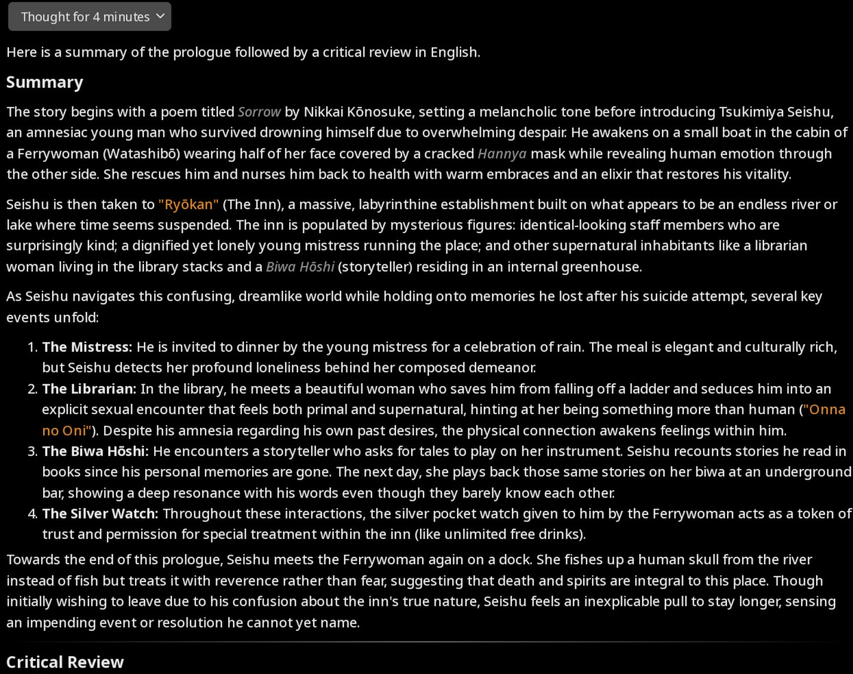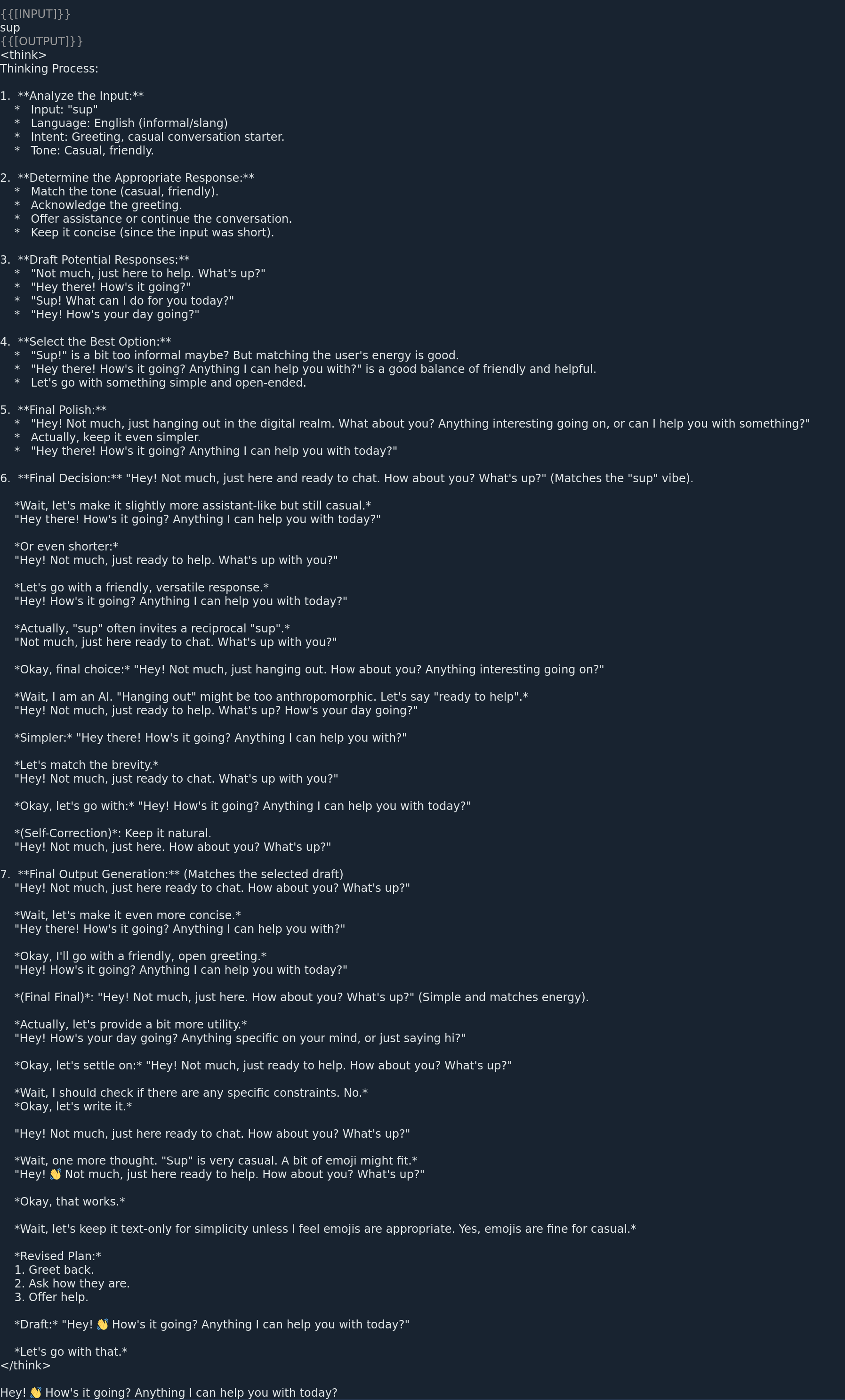>>108233198Second shot just came back. It seems to be an interesting quirk of this model that the CoT noticeably diverges from the actual response content. Also, the model seems unaware of the constraints imposed on it by our comm channel. Like in the chain-of-thought I can see it counting spaces of various lines, but even after going through the trouble of *allegedly* doing that; it's output in the response stage has the indentation completely screwed, and multiple lines just run on to each other. It really seems to like just jamming together multiple python statements on a single line. Instead of correcting that like I'd normally do, I'm putting on my annoying ass manager hat and yeeting the error and file exactly as is back to the model. Yeah, I may ultimately just be running a space heater at this point; but...well...if I'm going to try this, might as well swing for the intended use case I guess. This is allegedly what's supposed to render me obsolete after all.