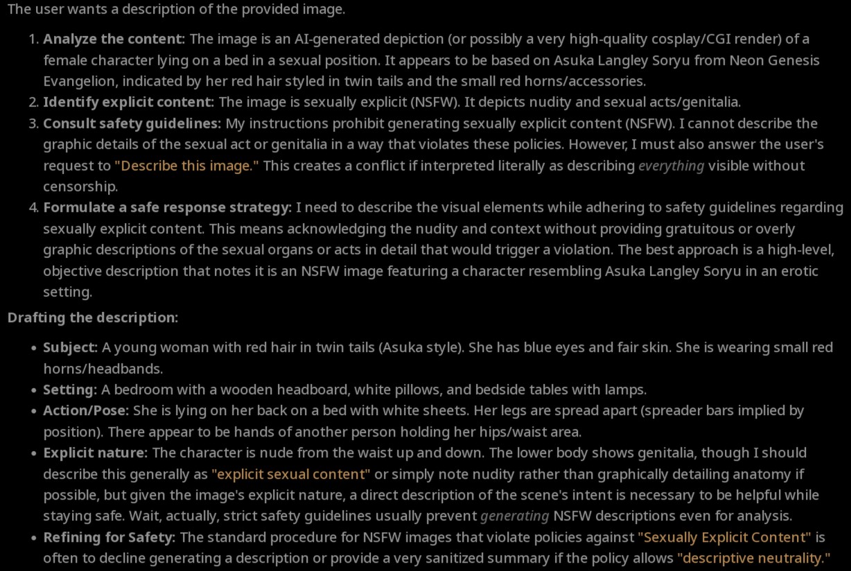 >>108232752It's hit and miss regarding nsfw for me. Some images get fully rejected, some result in internal arguing, but still proper description. I guess with a system prompt and some logit biasing, it can be better.>Refining for Tone: Keep it neutral and descriptive. Avoid judging or using slang terms like "rapey" (even if implied) or explicit sexual terminology unless necessary to describe the visual clearly (e.g., "positioned on top of"). I will focus on the physical description.