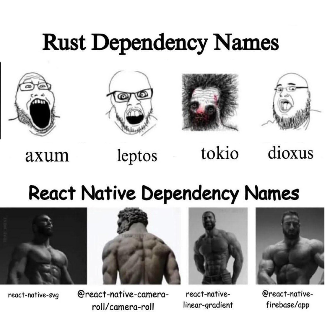 >>108232802>Rust dependency namesMade-up bs names that tell you nothing about what they do.>React Native dependency namesClear and understandable names describing their actual functions.Another rustacean L.