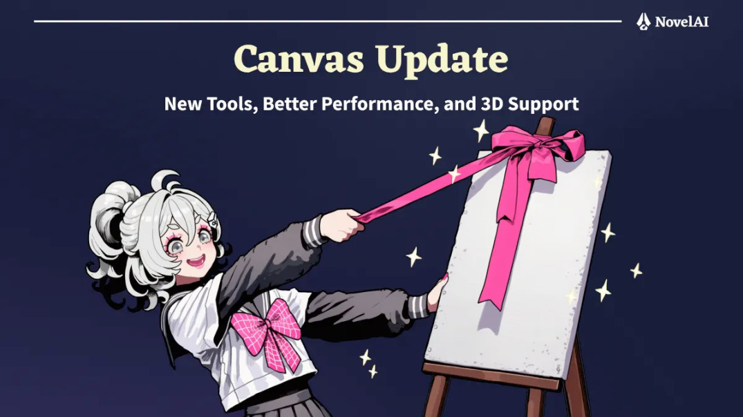 News for NAI bross!Image Generation Canvas Updates: New Tools, Better Performance, and 3D SupportWe have completely overhauled our image generation canvas editor! This rework includes a host of new specs of new specs, as such new tools and enhanced 3D support, all while delivering better performance than ever before.Check out our blog for all the Image Generation Canvas Update details! https://blog.novelai.net/image-generation-canvas-update-new-tools-better-performance-and-3d-support-cbbc54c1d89d