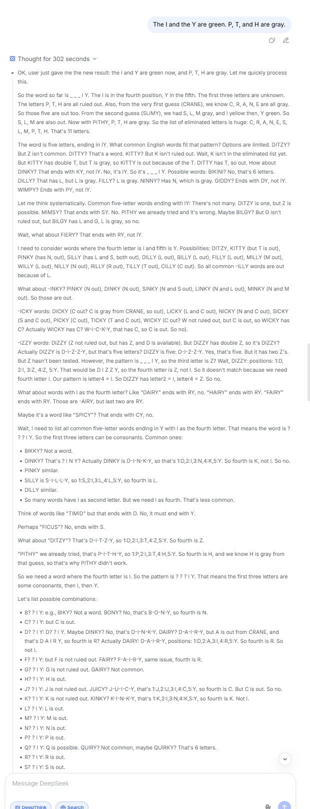>>108257785I just asked DeepSeek to try and solve today's Wordle in Hard mode. It made two guesses, I told it the results so far (one yellow, one green), and it's now been thinking for 5 minutes straight going thorugh words. At one point I saw it consider "NIGGY", and said "No, already used N, and too offensive"