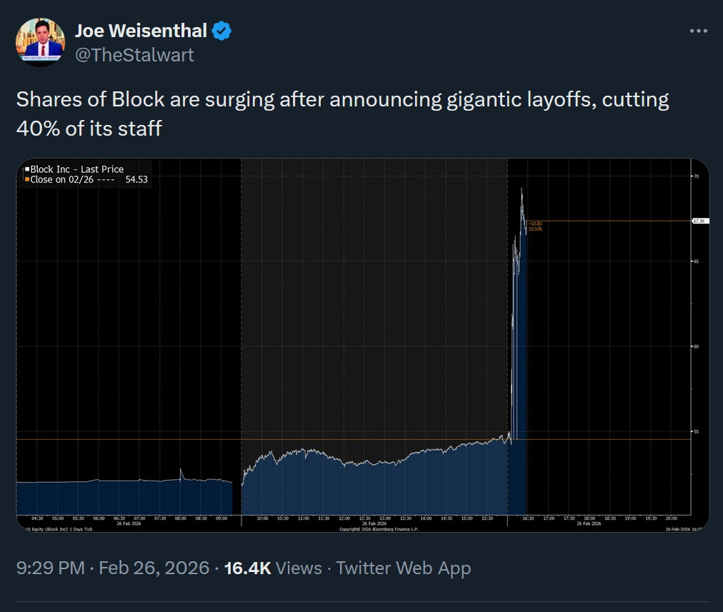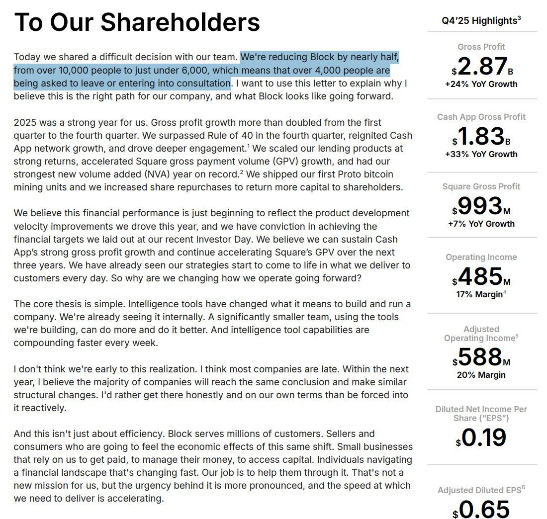 block lays off 40% of stafftheir numbers were actually up last yearexplicitly cite 'intelligence tool capabilities'suggest majority of companies will follow suit