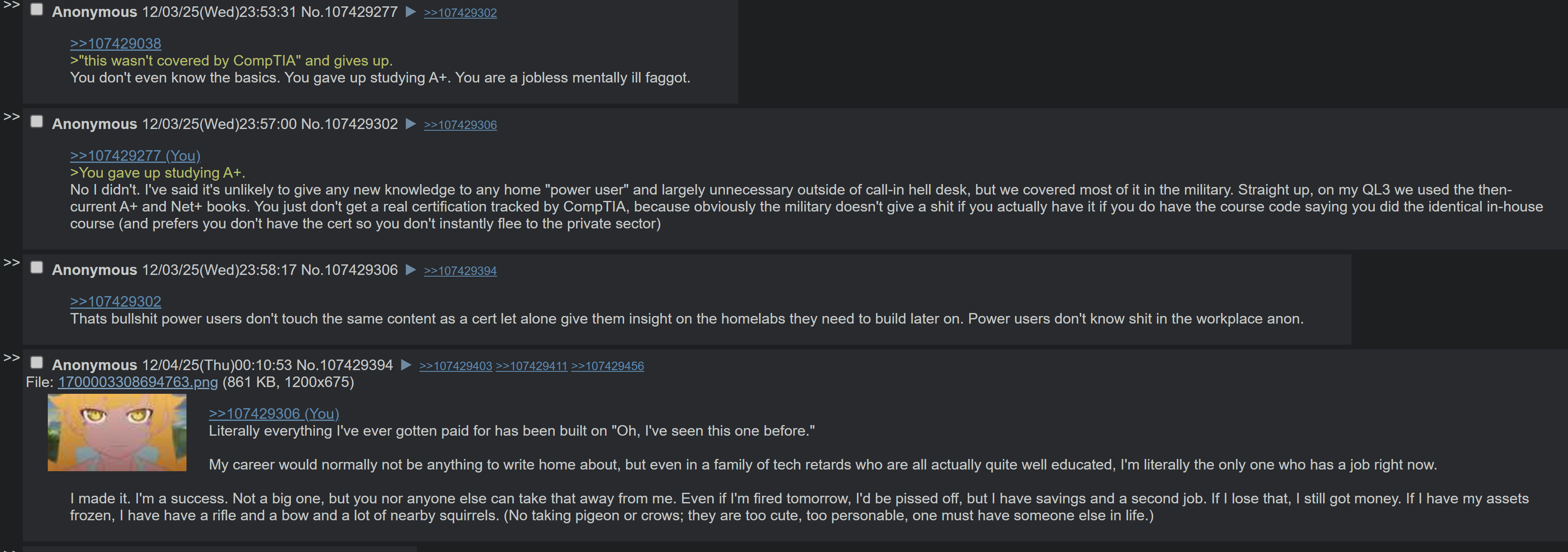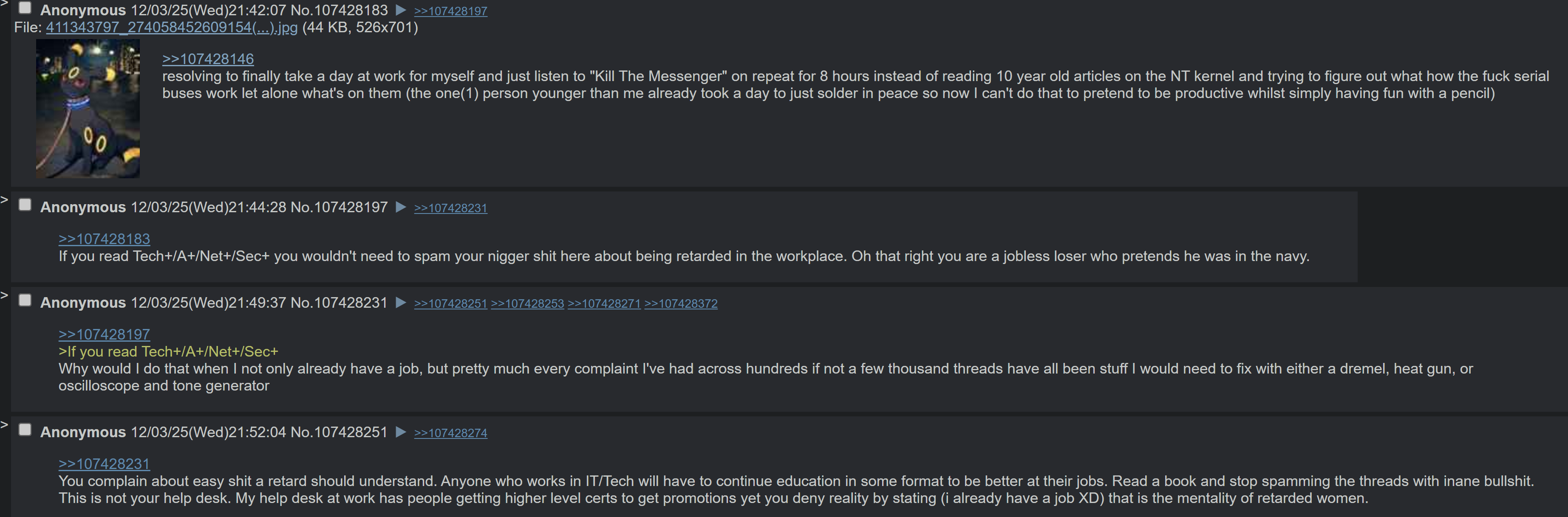 >>108258593He's not employed that faggot never talks about anything other than the fact that he's an insecure loser. Nothing he speaks about is IT related and majority of his posts are nigger spam. He also switches up his images to some gay shit to pretend he's someone else whenever people call him out.