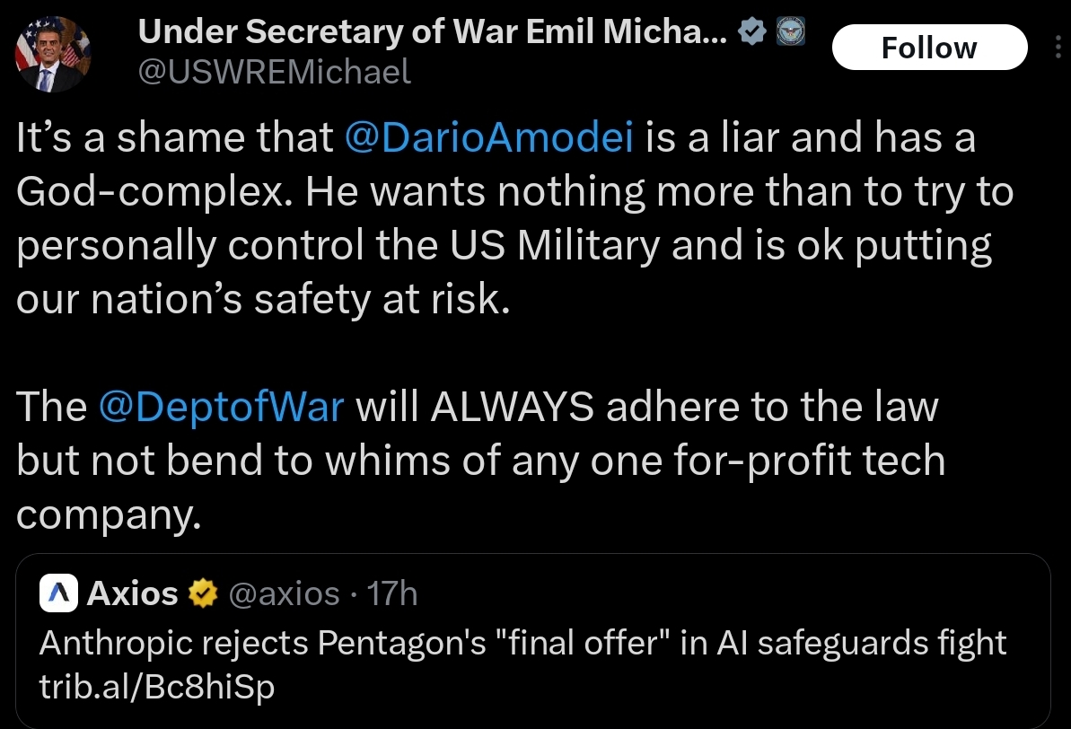 What you people need to understand is that this isn't a battle between Dario and Hegseth, it is a typical power tug between jews and the goyim. If Palantir (owned by Thiel and Karp, two gigakikes) uses Claude to kill Palestinians en masse, Dario doesn't care. But if the Goyim at the Pentagon want to have the same tool, Dario won't let the lowly goyim have it.Because AI ethics are rules for the goyim, not for Yhwh's chosen people