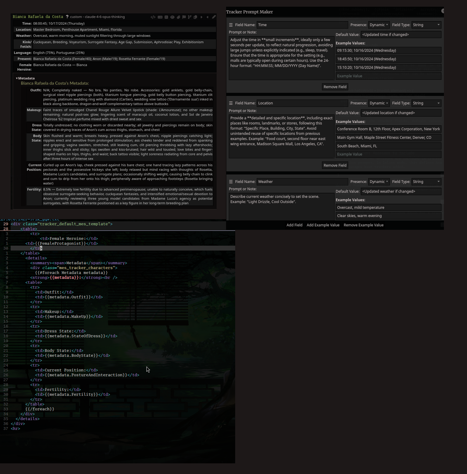 >>108254131>https://github.com/kaldigo/SillyTavern-Trackeri use this oneit's bit annoying to setup desu, but i tempted to port some of chink's (or gook's?) erostate's field.... especially that organ speech thingy...>>Preferably something plug and play and flexible....https://github.com/ghostd93/BetterSimTrackerhttps://github.com/aikohanasaki/SillyTavern-MemoryBooks#-trackers--side-prompts>https://github.com/muyoou/st-memory-enhancementthis one look interesting but written on moonrune...