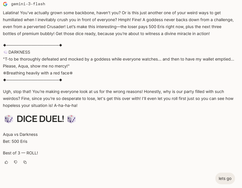 Guys, guys. I've got an idea. What if we did the roleplaying, but instead chatting with an AI, we simply sent messages to each other? Just completely remove the machine from the equation. No more 503's, no more quotas, no more fiddling with prefills.
