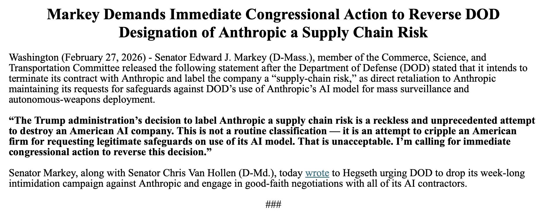 >T-They can't do this... They don't have the legal a-authority...https://www.anthropic.com/news/statement-comments-secretary-warWhat this means for our customersSecretary Hegseth has implied this designation would restrict anyone who does business with the military from doing business with Anthropic. The Secretary does not have the statutory authority to back up this statement. Legally, a supply chain risk designation under 10 USC 3252 can only extend to the use of Claude as part of Department of War contracts—it cannot affect how contractors use Claude to serve other customers.In practice, this means:If you are an individual customer or hold a commercial contract with Anthropic, your access to Claude—through our API, claude.ai, or any of our products—is completely unaffected.If you are a Department of War contractor, this designation—if formally adopted—would only affect your use of Claude on Department of War contract work. Your use for any other purpose is unaffected.Our sales and support teams are standing by to answer any questions you may have.