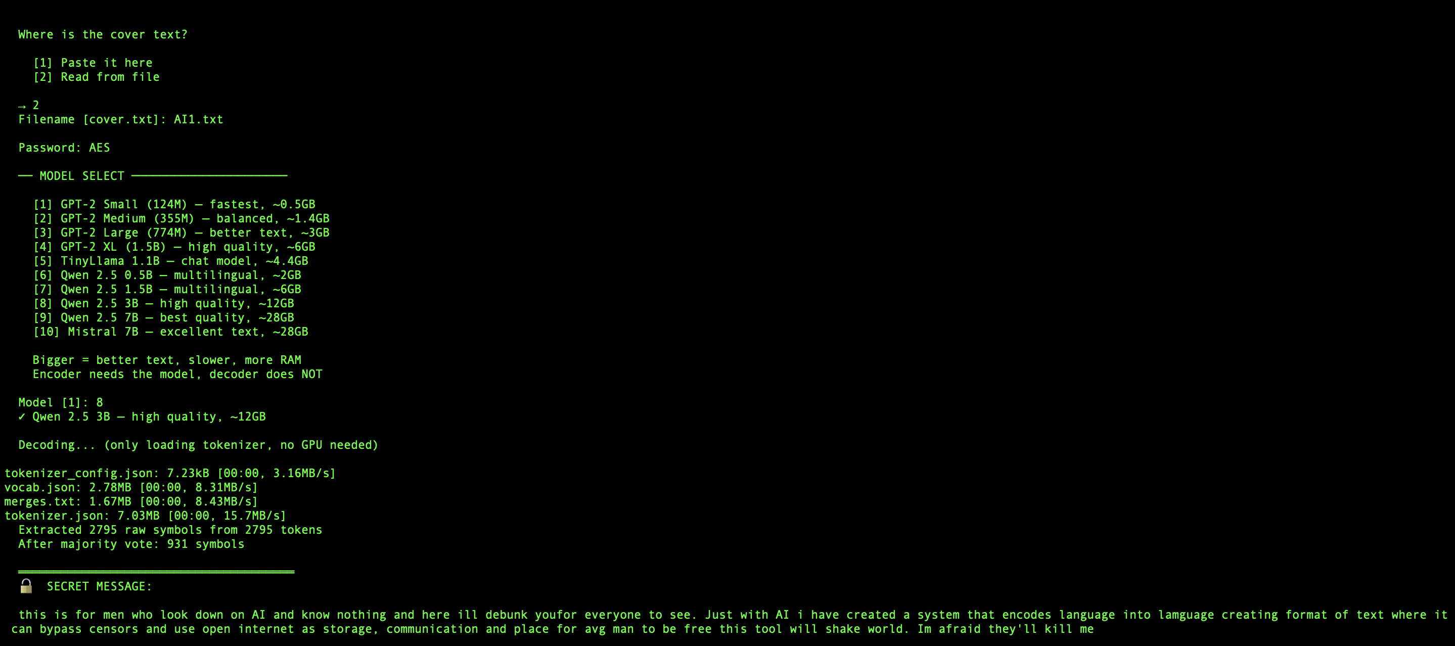 >instead of loading whole model I can use tokenizer on large model and decrypt message. So sender could use 400b paprameter model but a phone user can decode it by having access to key, tokens and be able to read contents. So the hardware limitation has been bypassed
