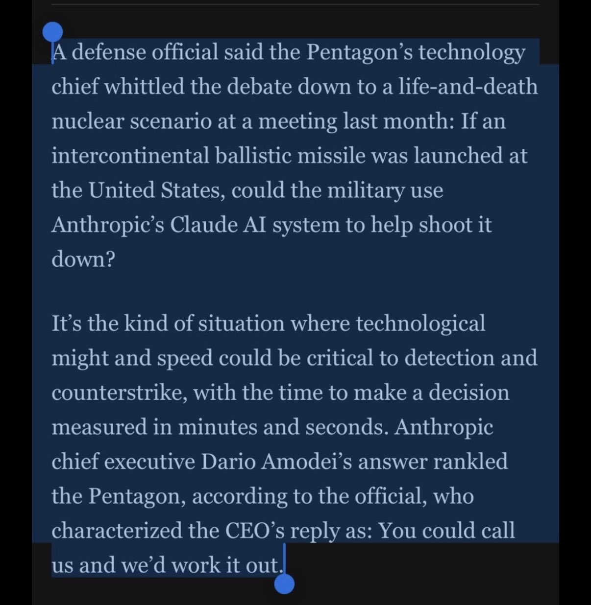 >>108259950The fact that the DOD has such a skewed understanding of AI that they think a language model can help shoot down a missile is frightening.