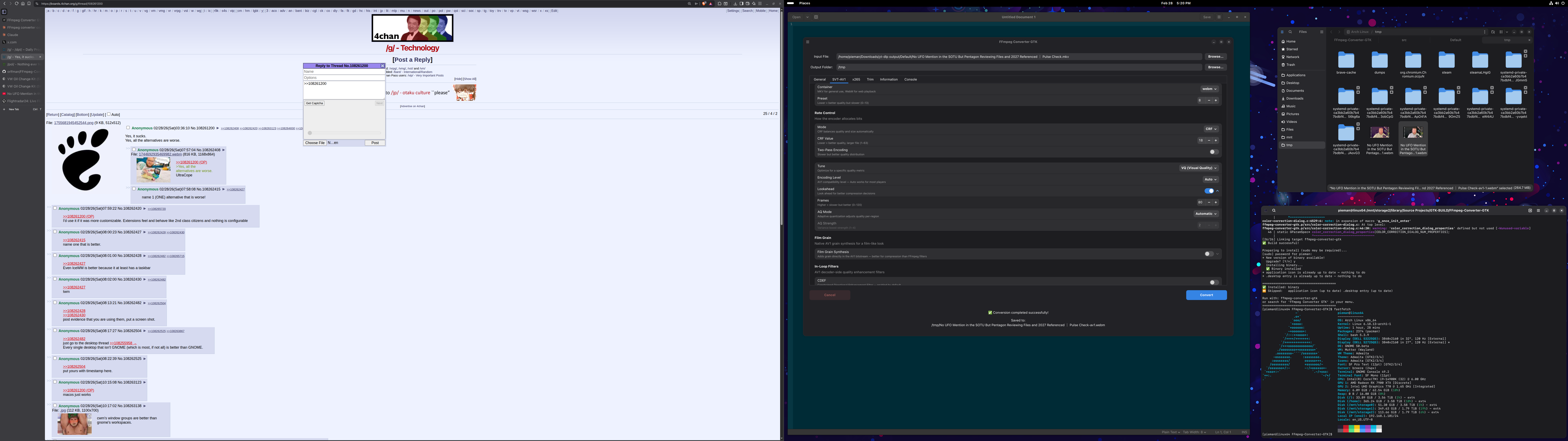 >>108262482just go to the desktop thread >>108255958Every single desktop that isn't GNOME (which is most, if not all) is better than GNOME.