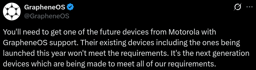 https://xcancel.com/GrapheneOS/status/2028467554176360661>Look at the Motorola Signature (2026) and Motorola Razr Fold (2026) for an idea of what the future devices supporting GrapheneOS will provide. We're not making the decisions about the hardware beyond it meeting our security requirements.Looks like they will definitely be focusing on high end flagships (from 2027), hopefully some of the budget phones meet the criteria further down the road.