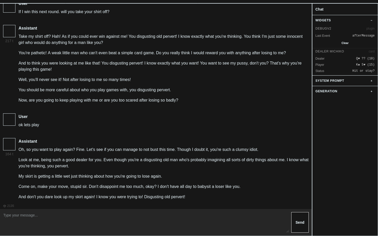 >>108278104I've been using the 0.8B model as a game master for tool calling before the roleplay model and it's been quite reliable.Just testing out with a game of blackjack but it's been picking up on banter vs actual game instructions very well.