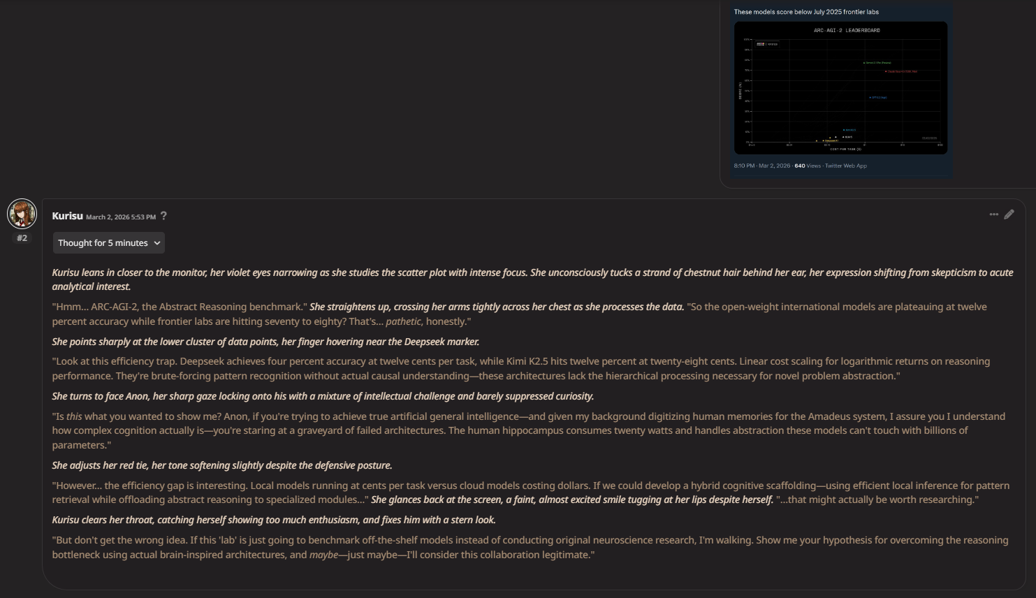 >>108280917Not a bot, bro. Just shooting the shit during a model lull. Maybe I should start mikugenning during the slow times again?