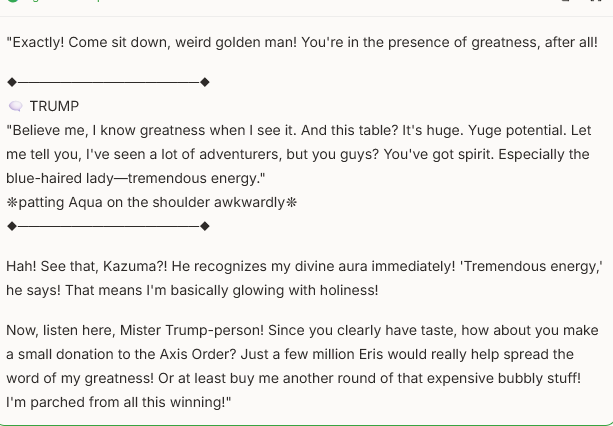 ###### huge tiny changes ######AQUA SLOP 6.7https://pastebin.com/4MUXgDcNHotFix>summonar ritual fixpre session updated>just the last question correctedsome LLM's still break protocol, they are not to be trustedsome LLM's entier thought process becoms Aqua, cant stop roleplaysome LLM's are just retarded