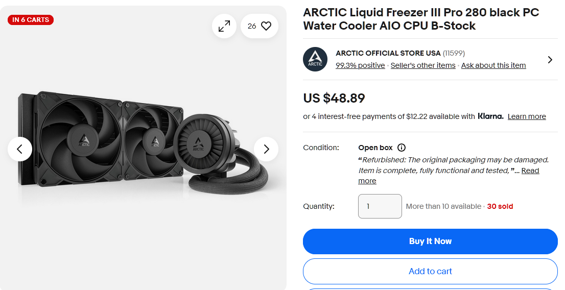 >>108281116Arctic has an official US eBay account that sells B-Stock (refurbished) AIOs at a steep discount.These AIOs are mostly returned because of case fitment issues and have the same 6 year warranty.A lot of people end up with brand new AIOs.https://www.ebay.com/str/arcticofficialstoreusa/Refurbished-Offers/_i.htmlNot a big change to your total system cost though.