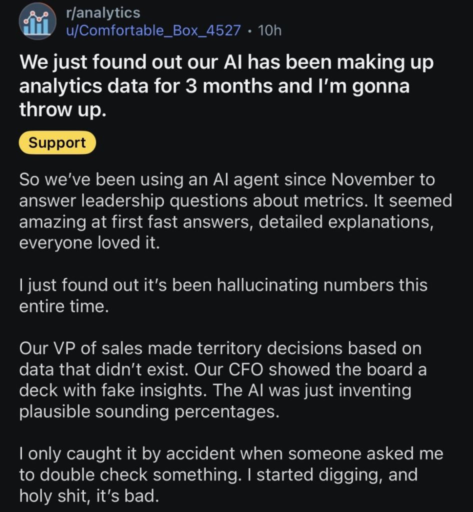 >>108281936I don't understand how that happenes. If you feed the model your data and ask it questions it will have numbers to quote but if you don't give it any data why would you expect it to have access to your sales data.Furthermore how do you not know your data well enough to do a sanity check simply by glancing at what it produces.You have the same issues when you ask a subordinate to construct a report. You can't just assume he is correct and despite trusting him you must also verify the results.I don't want to be mean but that guys issue is not AI.