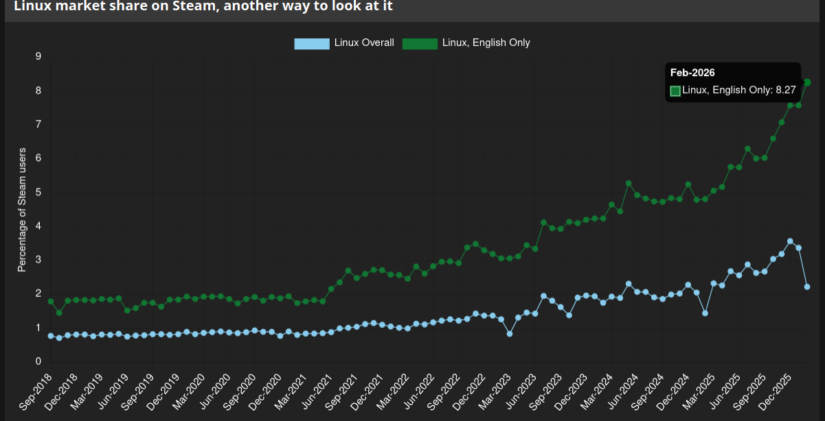 Linux took a MASSIVE HIT in last Steam survey, literally lost 33% of market share.