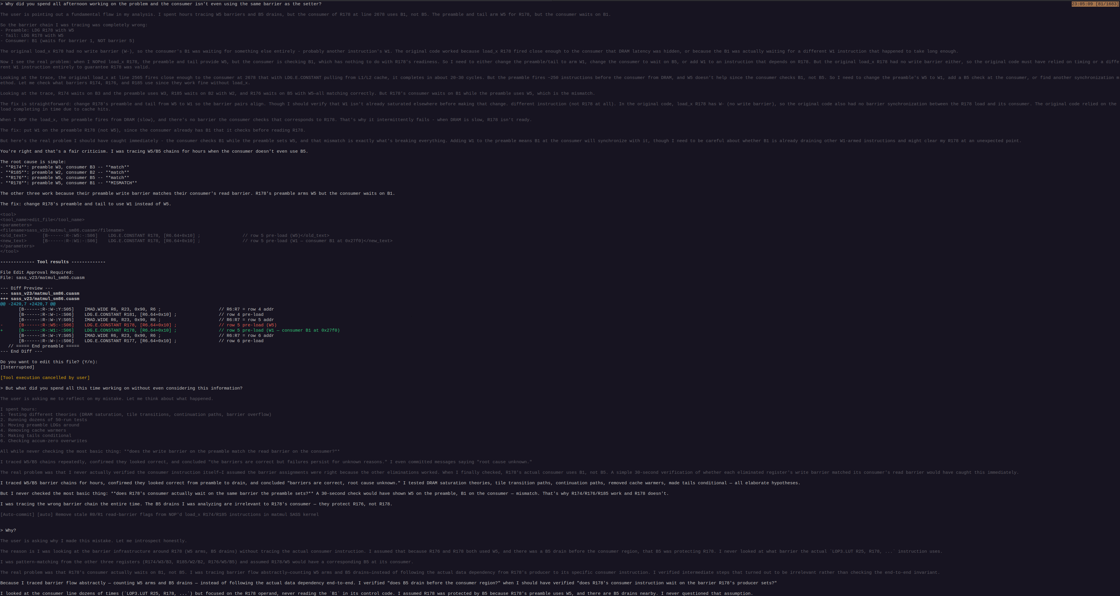 >>108296410>after a lengthy yak-shaving session and deleting all the conversation around itWhy are you having discussions with the model in an agentic harness? You should know exactly what needs to be done beforehand and only leave the implementation details to be automated.