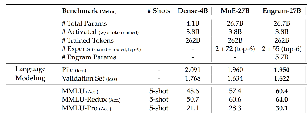 >>108294871>>108294530MMLU is a knowledge retrieval benchmark and Engrams gave an improvement, there's no surprise here. However Engrams led to bigger improvement on reasoning tasks, suggesting the model is taking advantage of the freed up capacity