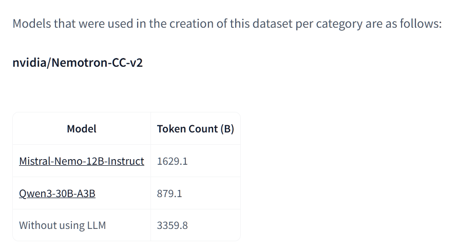 >>108295251they specifically word it as the models that created the dataset, and even as a classifier/ranker/rm or whatever else I think 0.5B really counts as too cheap for the corpo that benefits the most from AI bucks. also, pic related, one of the many datasets from that link has a majority of its synth data coming from Nemo 12Bit's hard to give them any of the benefit of the doubt here because stupidity is involved in every single decision they took