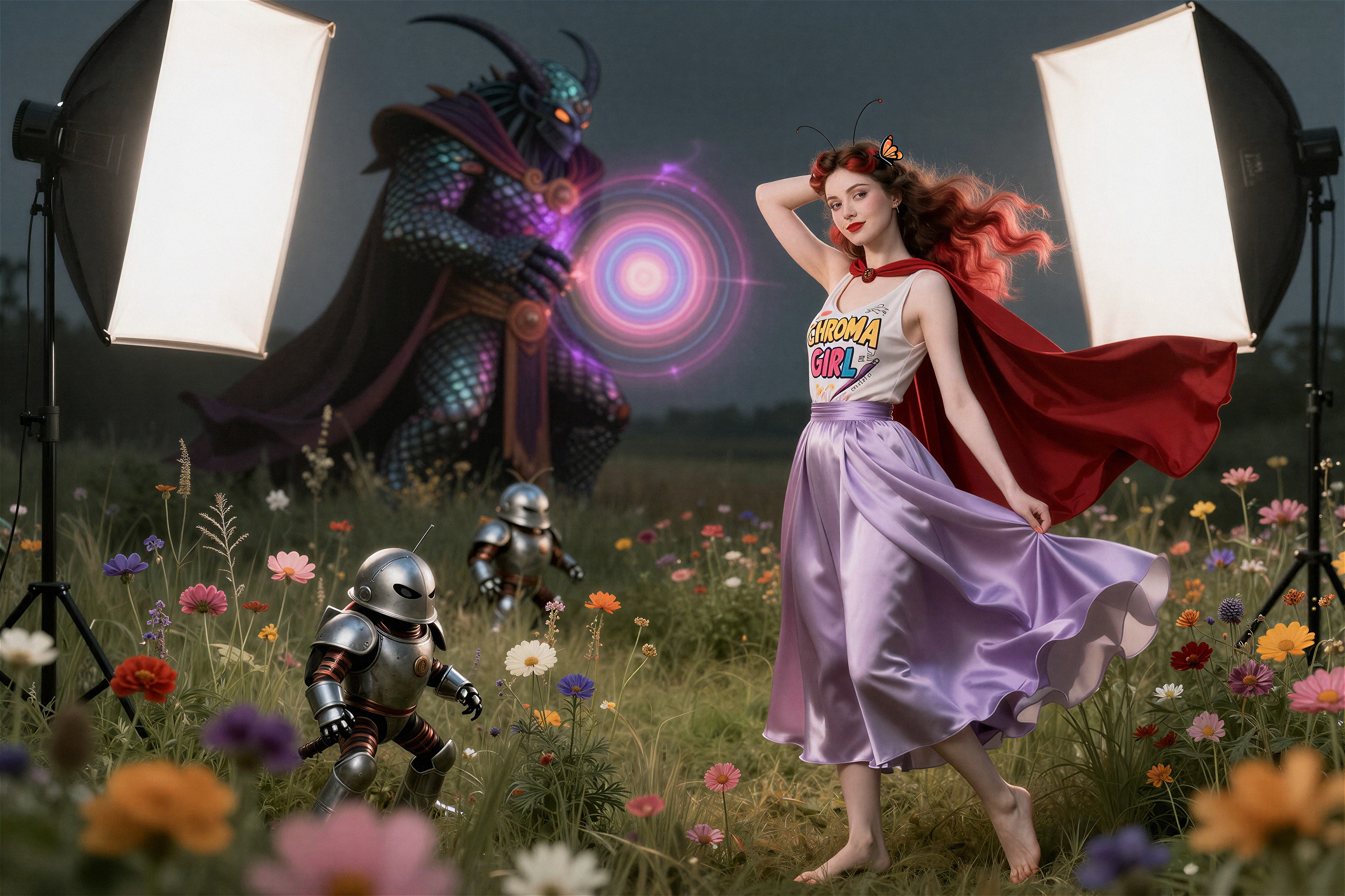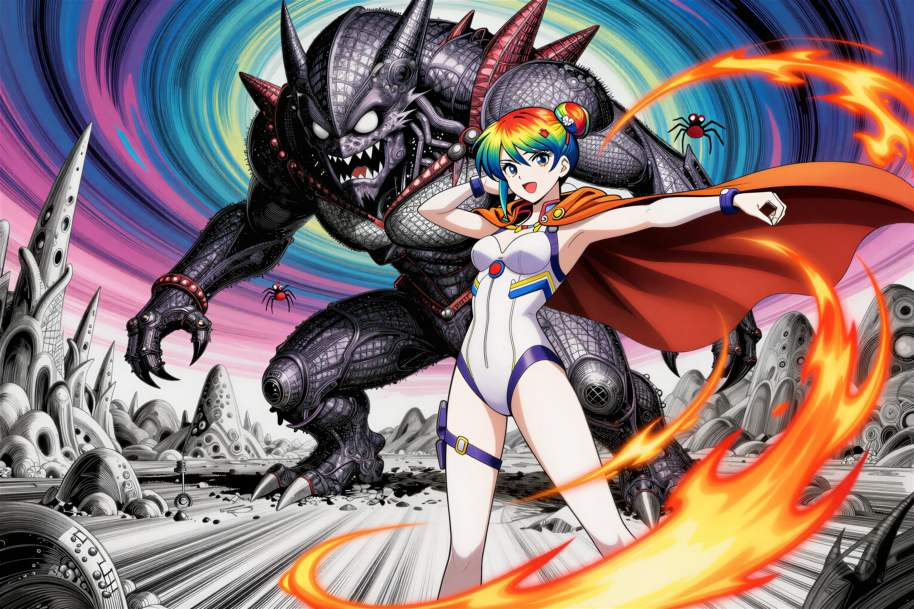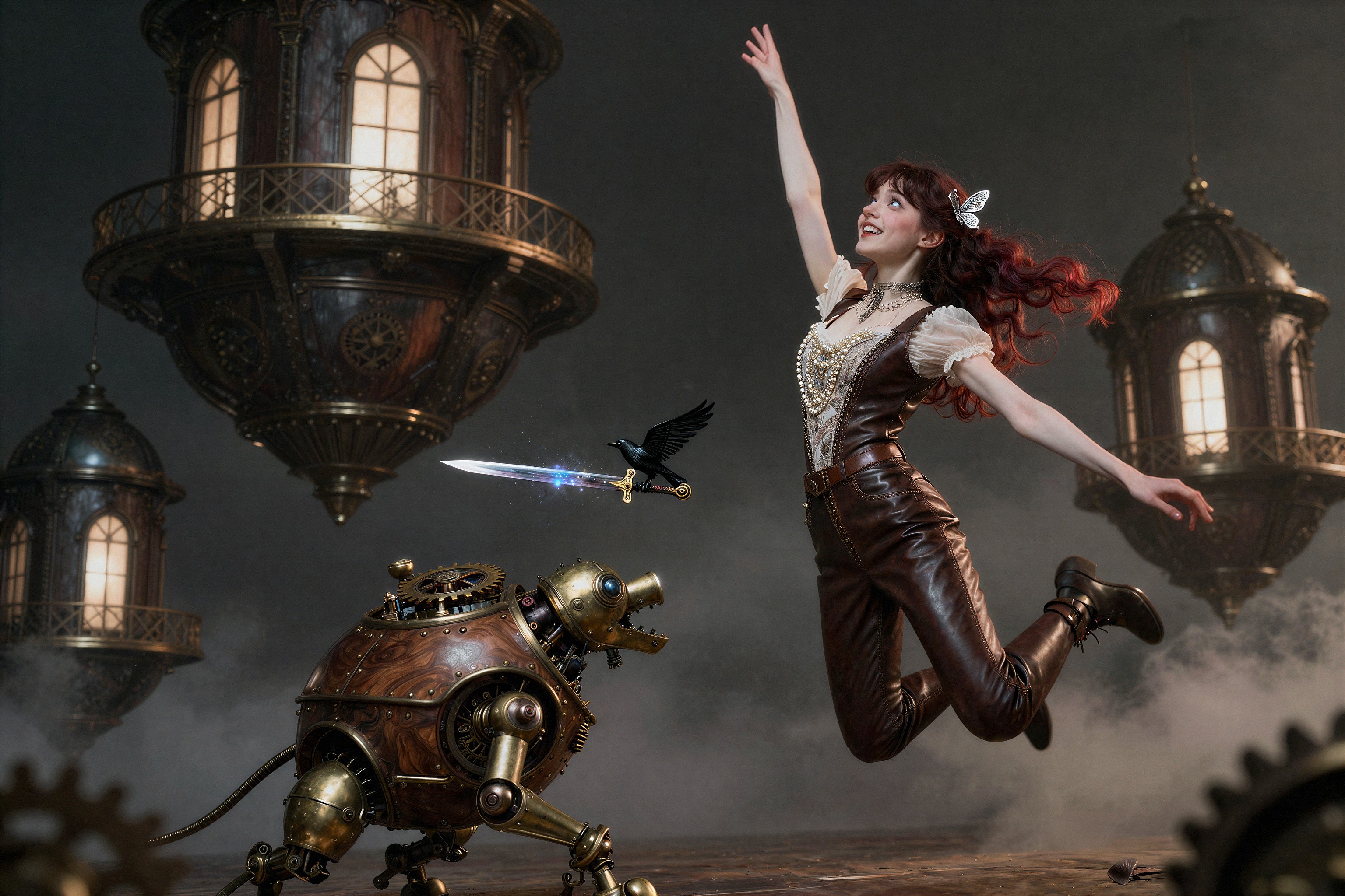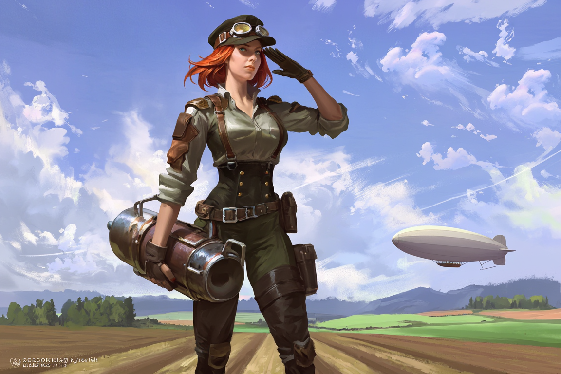 >>108303480I used this prompt>"A detailed concept art piece of a futuristic warrior standing in a post-apocalyptic landscape, with towering ruins, distant fires, and a robotic companion by their side."And changed it a bit to.>"A detailed concept art piece of a Steampunk redhead female engineer wearing aviator cap and goggles on forehead, she is saluting while holding a jetpack, standing firm on the middle of farm field landscape, with clear blue skies, distant clouds, and a giant zeppelin in the distance"So I guess a clean "template" version of this prompt would be>A detailed concept art piece of a <character>, <location> landscape, with <objects in the background>, distant <object in the sky>, <rest (optional)>