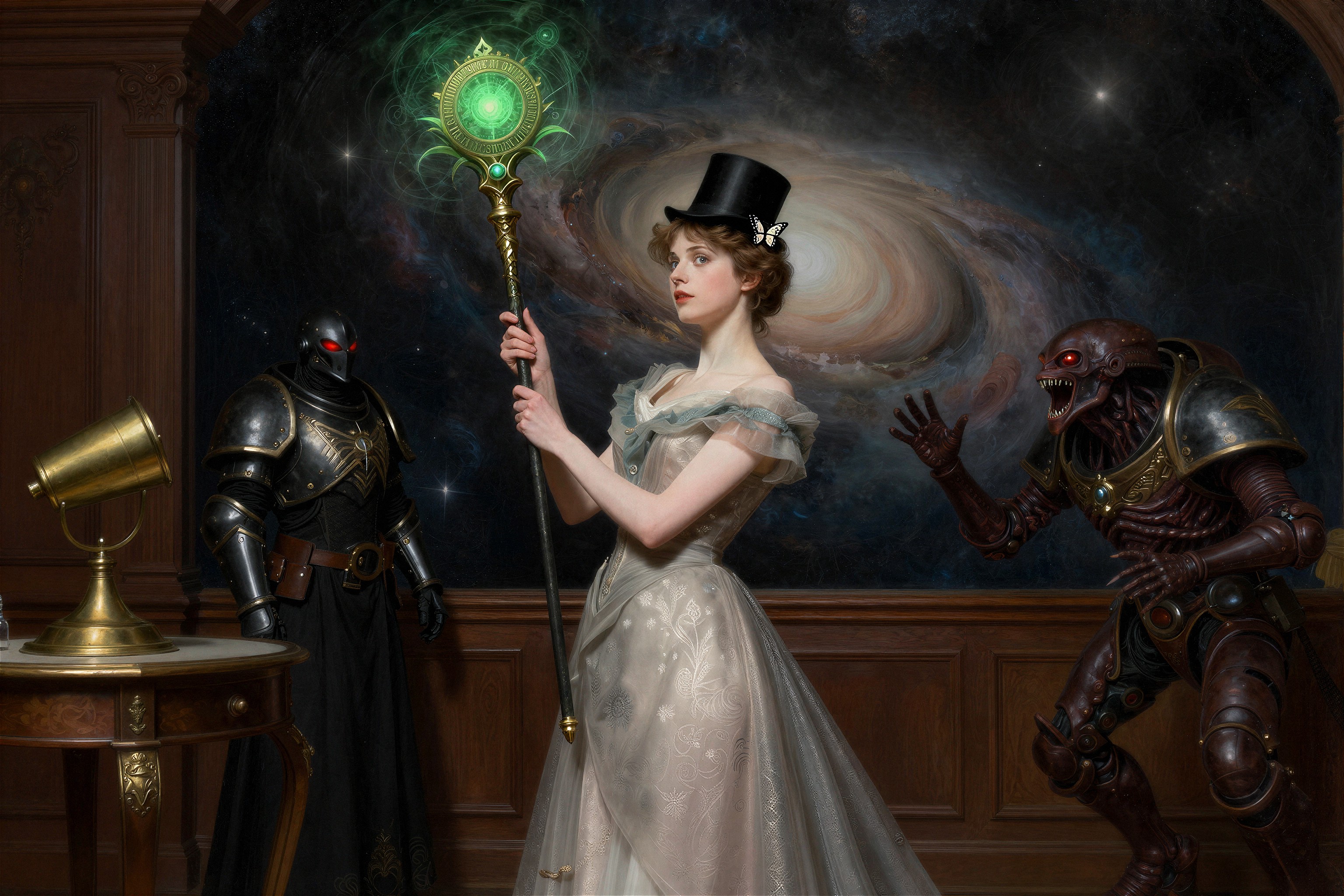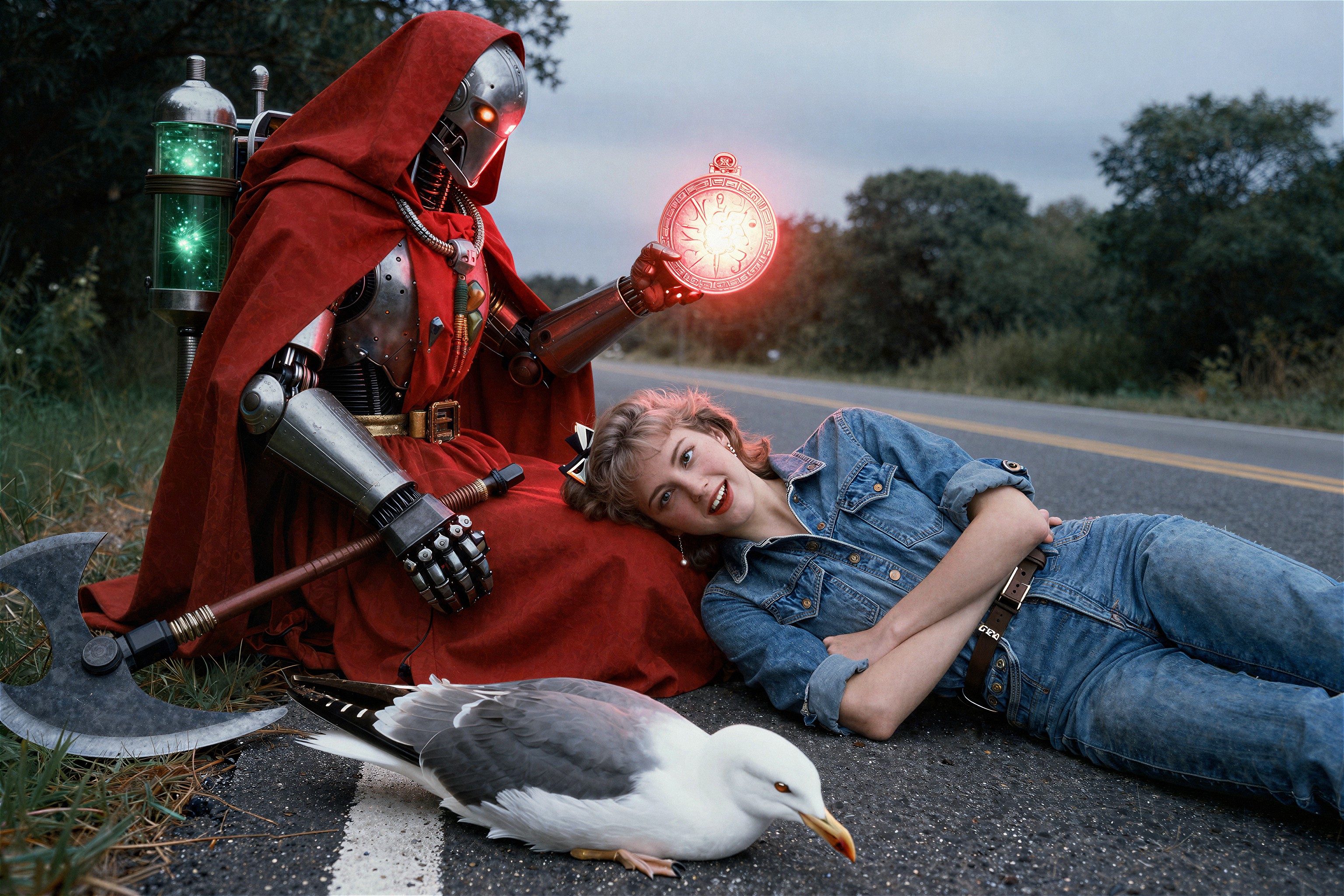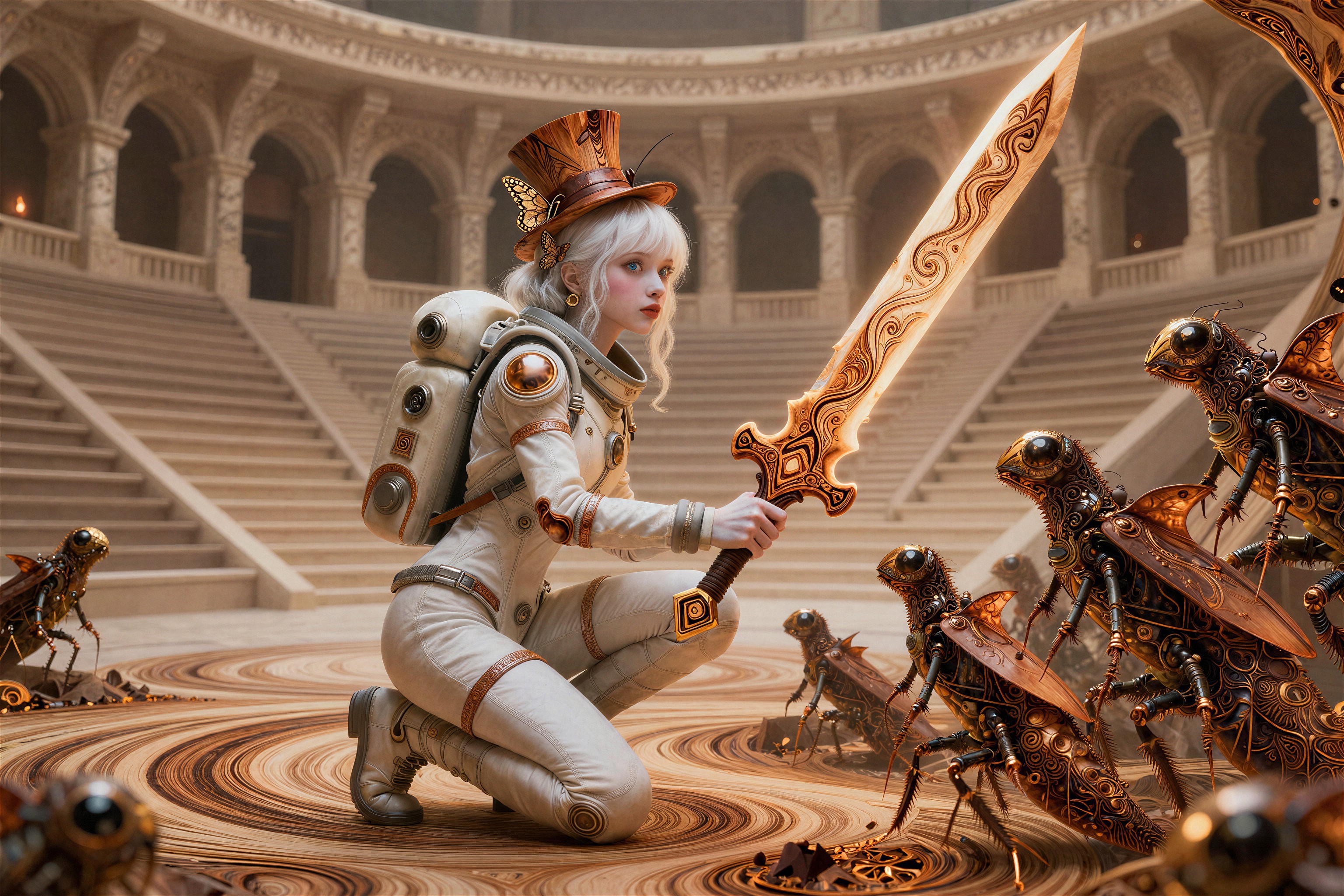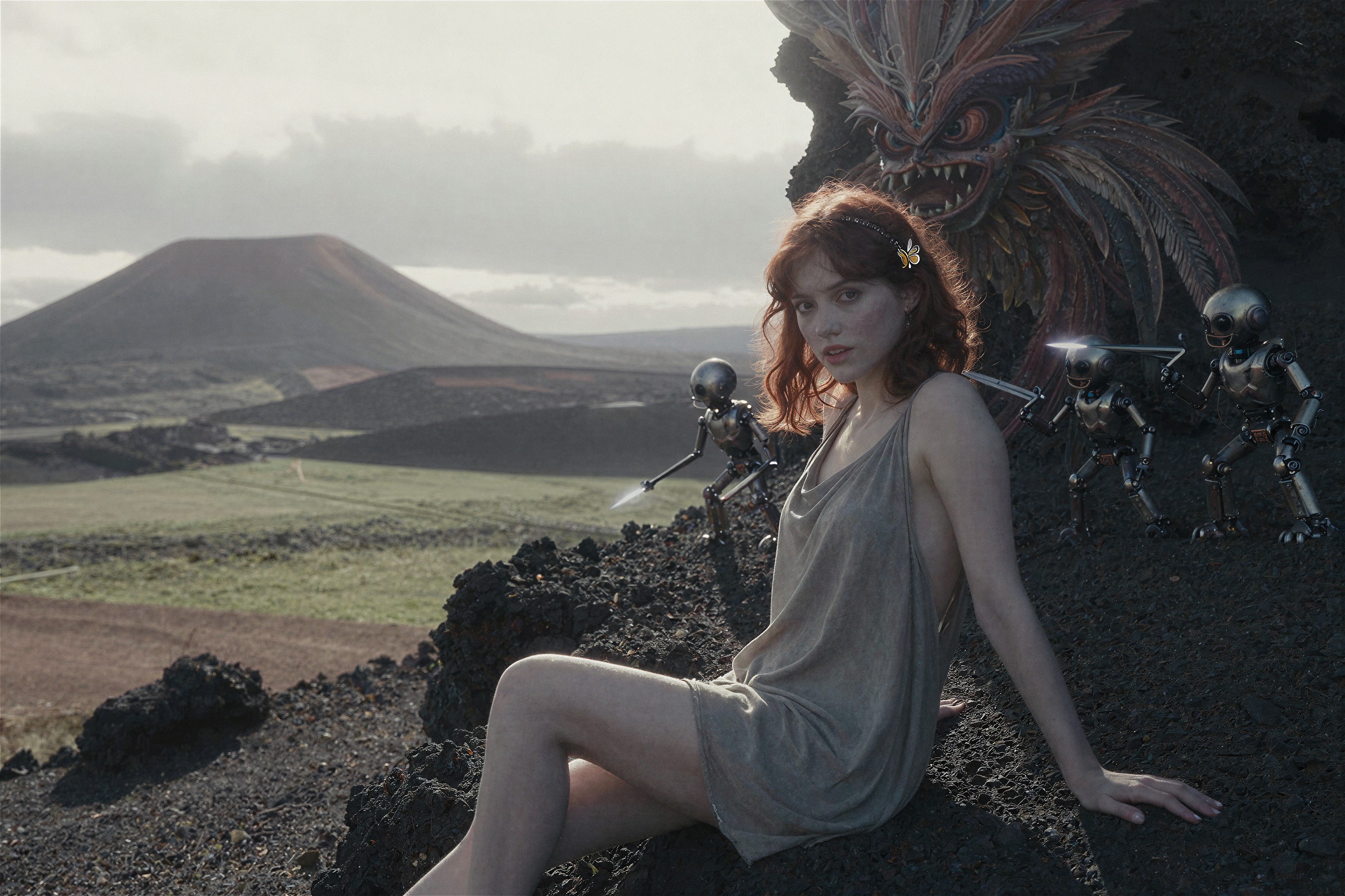 >>108303480I used this prompt>"A detailed concept art piece of a futuristic warrior standing in a post-apocalyptic landscape, with towering ruins, distant fires, and a robotic companion by their side."And changed it a bit to.>"A detailed concept art piece of a Steampunk redhead female engineer wearing aviator cap and goggles on forehead, she is saluting while holding a jetpack, standing firm on the middle of farm field landscape, with clear blue skies, distant clouds, and a giant zeppelin in the distance"So I guess a clean "template" version of this prompt would be>A detailed concept art piece of a <character>, <location> landscape, with <objects in the background>, distant <object in the sky>, <rest (optional)>