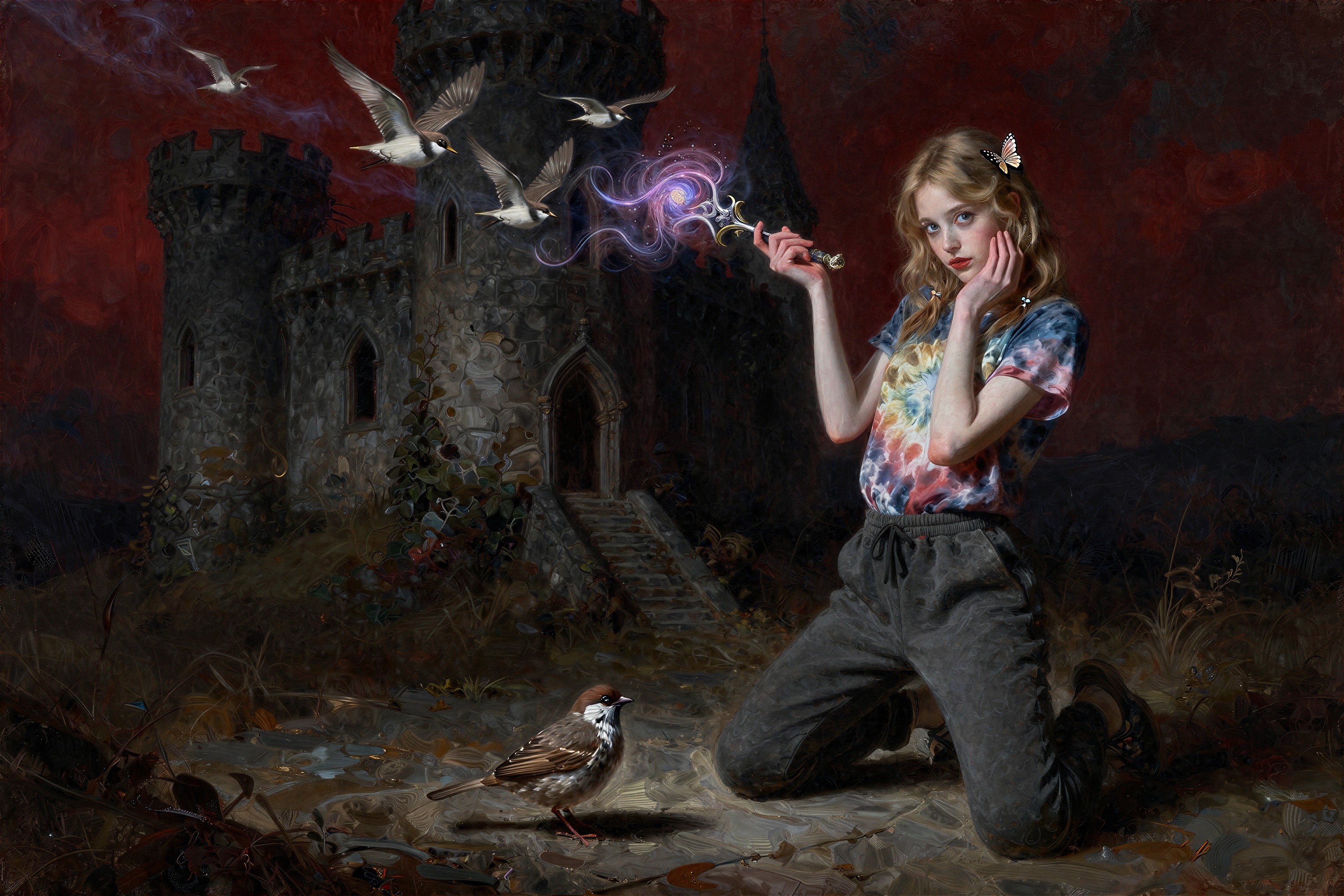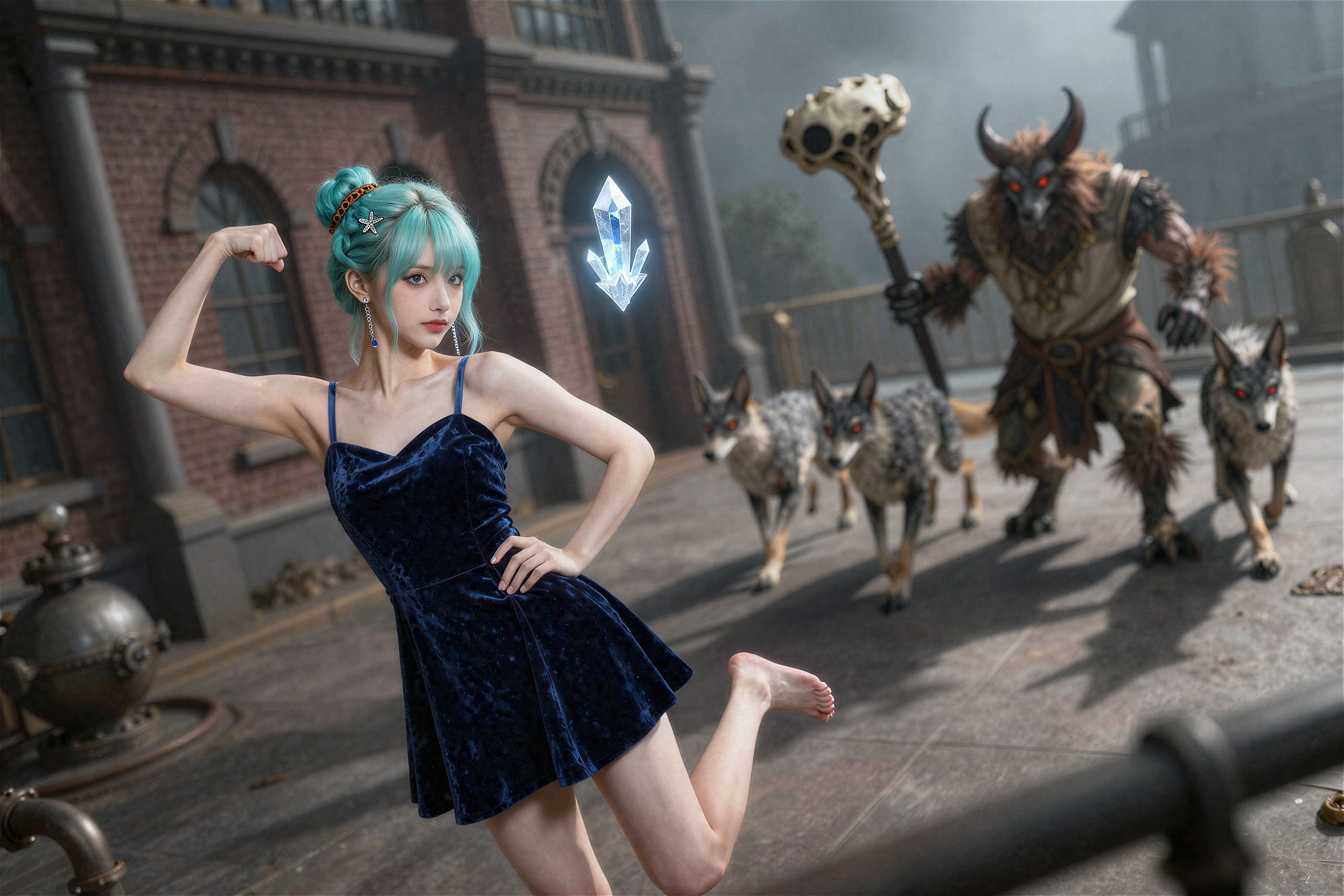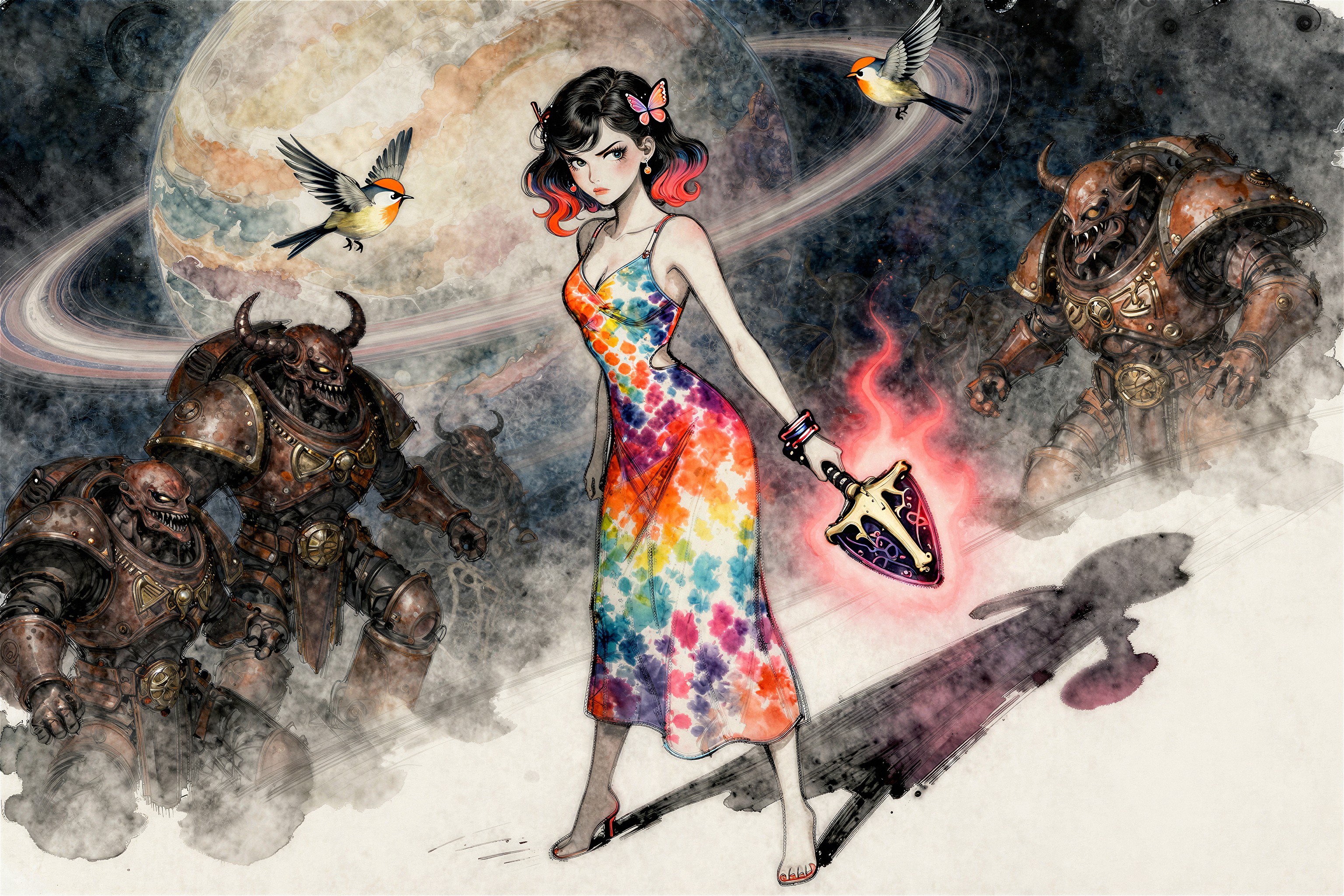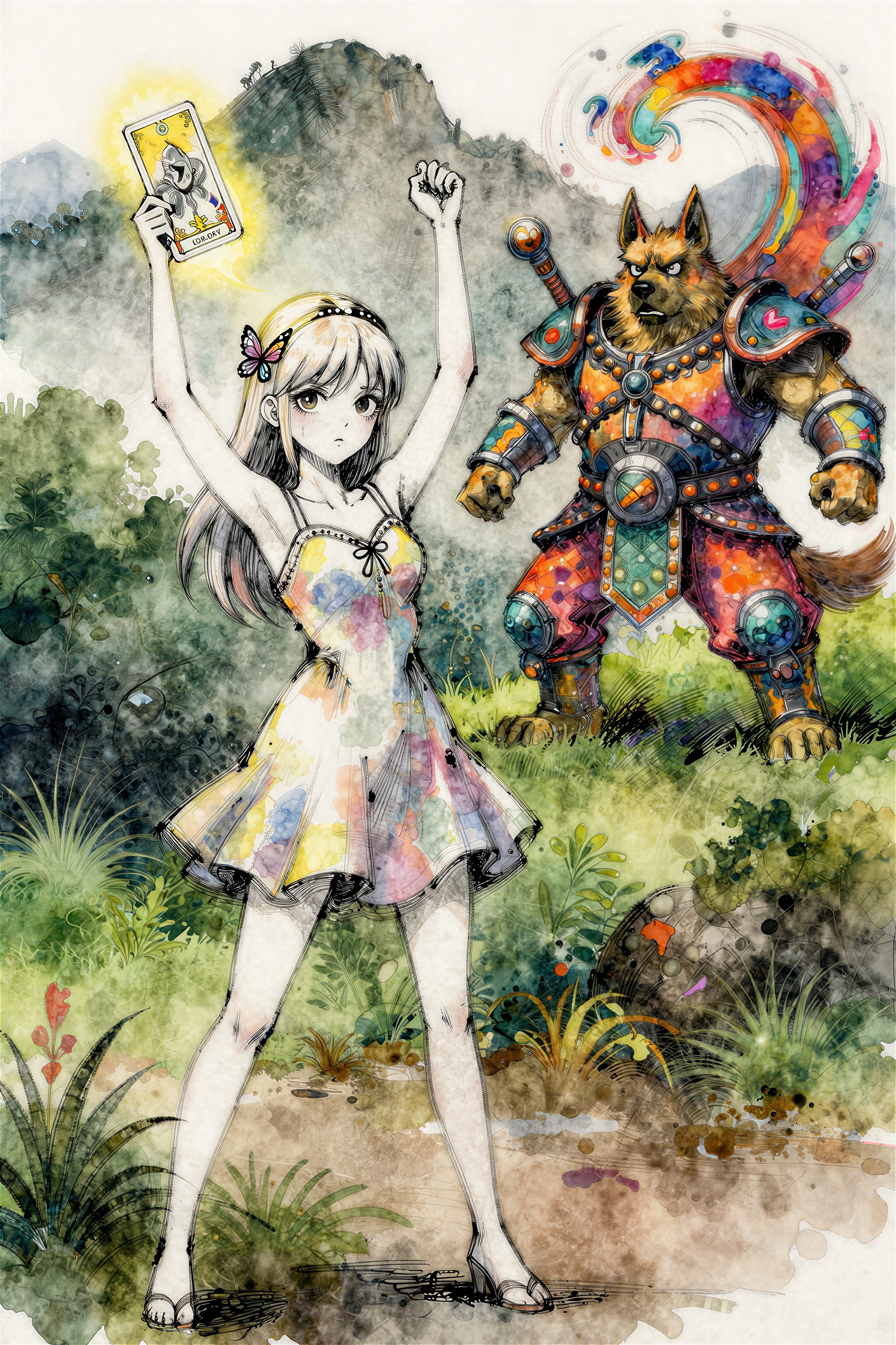 >>108303480I used this prompt>"A detailed concept art piece of a futuristic warrior standing in a post-apocalyptic landscape, with towering ruins, distant fires, and a robotic companion by their side."And changed it a bit to.>"A detailed concept art piece of a Steampunk redhead female engineer wearing aviator cap and goggles on forehead, she is saluting while holding a jetpack, standing firm on the middle of farm field landscape, with clear blue skies, distant clouds, and a giant zeppelin in the distance"So I guess a clean "template" version of this prompt would be>A detailed concept art piece of a <character>, <location> landscape, with <objects in the background>, distant <object in the sky>, <rest (optional)>