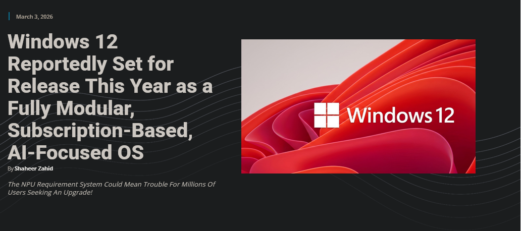 https://tech4gamers.com/windows-12-reportedly-relasing-2026-modular-ai-focused-os/>Windows 12 Reportedly Set for Release This Year as a Fully Modular, Subscription-Based, AI-Focused OSUh oh, good luck storing your NSFW in last windows