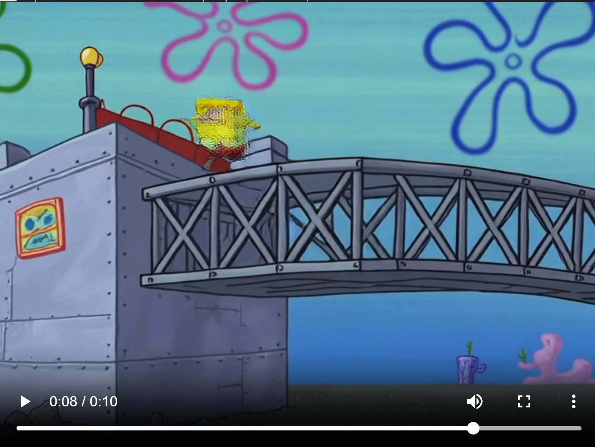 lmaoSpongebob says "hey patrick, wanna see an impression of a troon?". Patrick says "Sure Spongebob!". The scene transitions to Spongebob running and jumping off a tall bridge.https://files.catbox.moe/ar3q7w.mp4