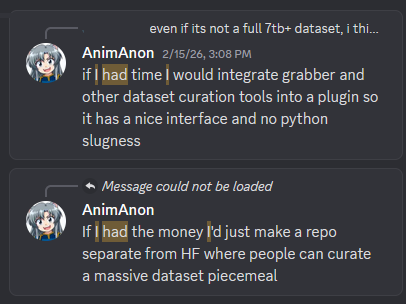 >>108305846>make a repository separate from hugging face where people can curate a massive dataset.Is this real? Who is he trying to scam?