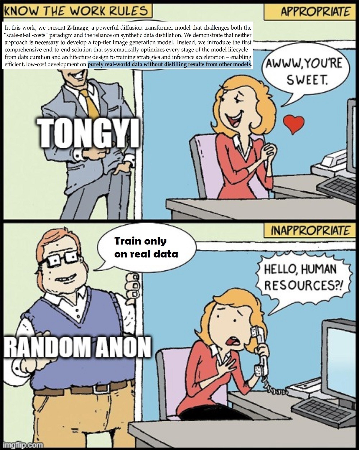 >>108306681>Did they train on lots of synthetic data or something?they did, only the Z-image series claims to have only trained on real data only