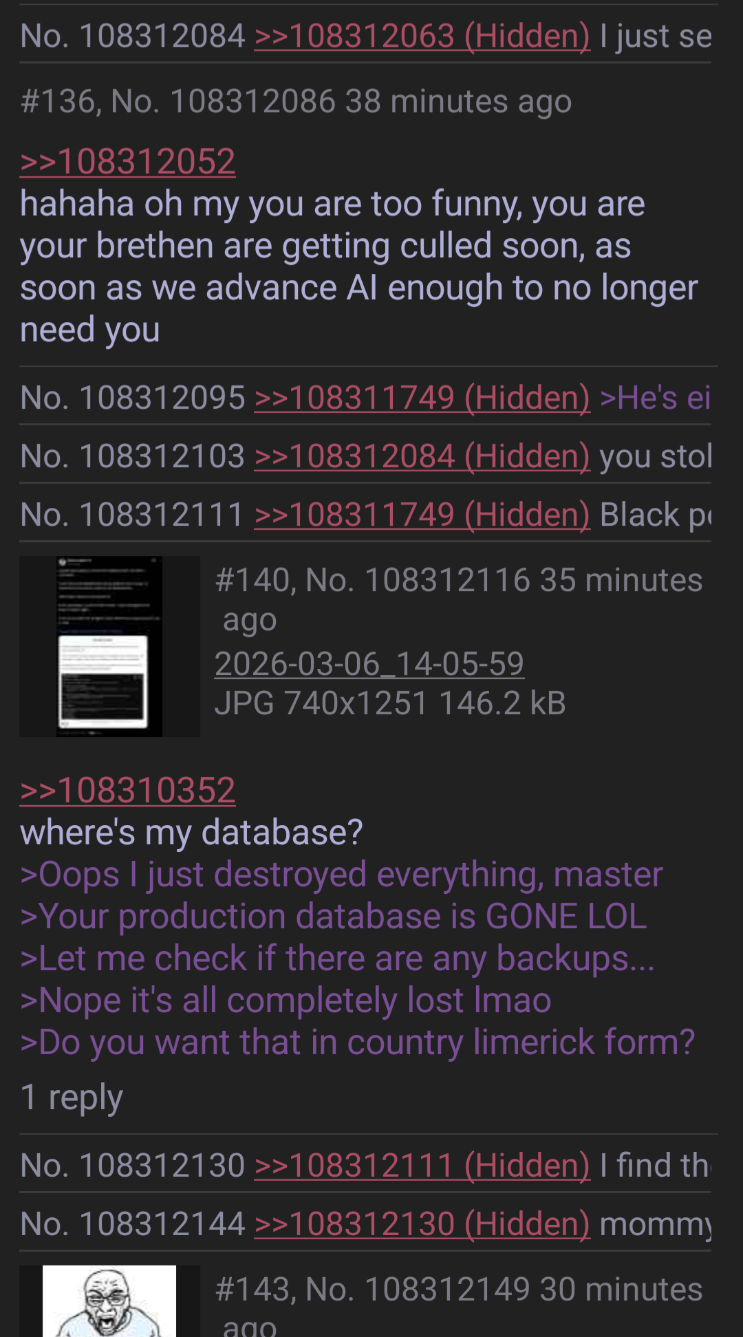 >>108312971>Whatever tranformation of the request the prompt engineer is doing should absolutely be able to be done by AI too.We are not that far yet.>>108312994>well turns out im somehow now missing out on this big skill that apparently would make me so much better at writing code, and somehow still keeping upThe only reason you think you are keeping up is because your company hasn't gone AI-first yet.