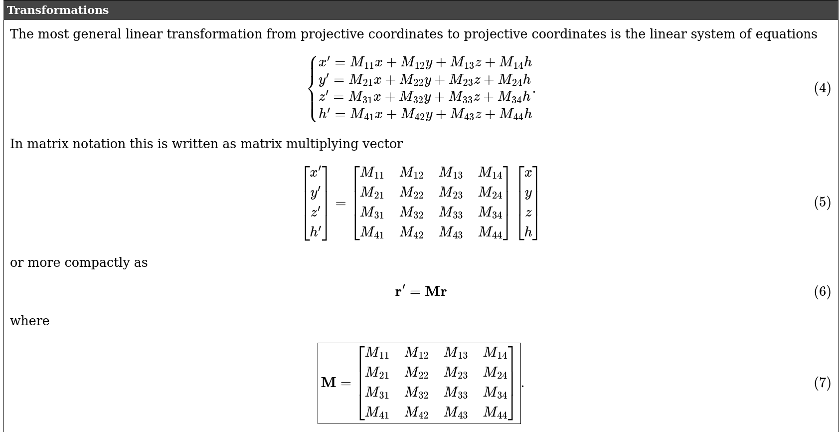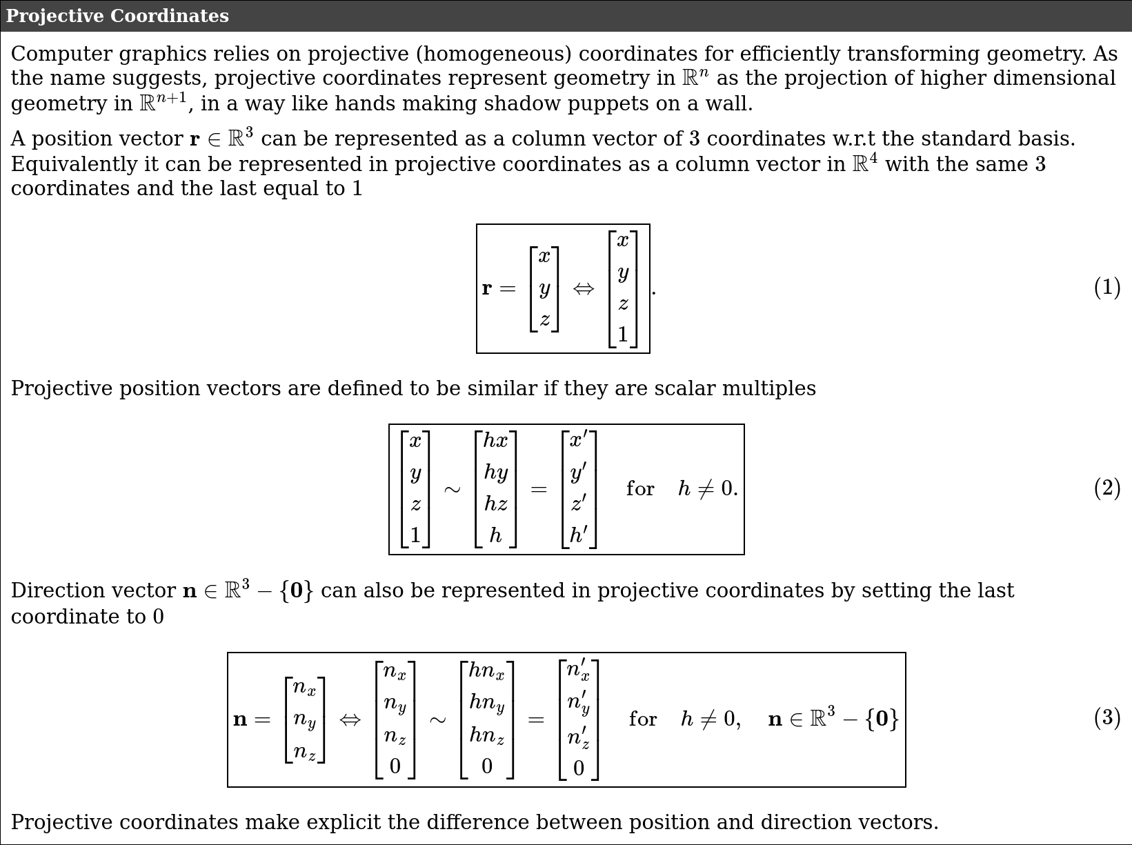 you don't need to know all the details of projective coordinates, just understand the equivalence between representations of projective coordinates and the difference between postion and normal representations