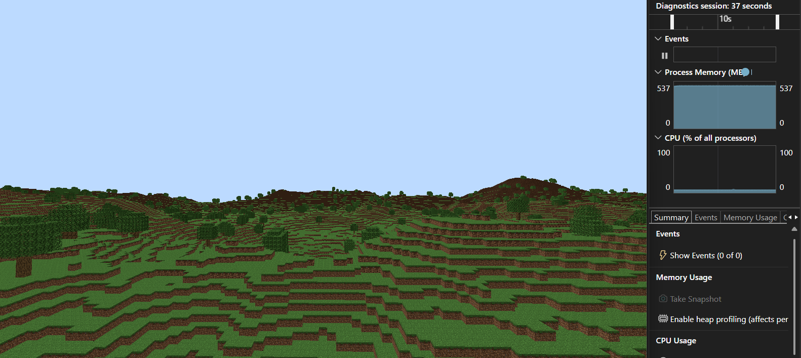 Furthermore I fixed my cross chunk feature problem. Basic terrain generation happens on a separate and when finished the main thread generates features (trees, ores, grass) where neighbors can be safely accessed and modified. Chunk generation isn’t wholly multi threaded anymore but it works.