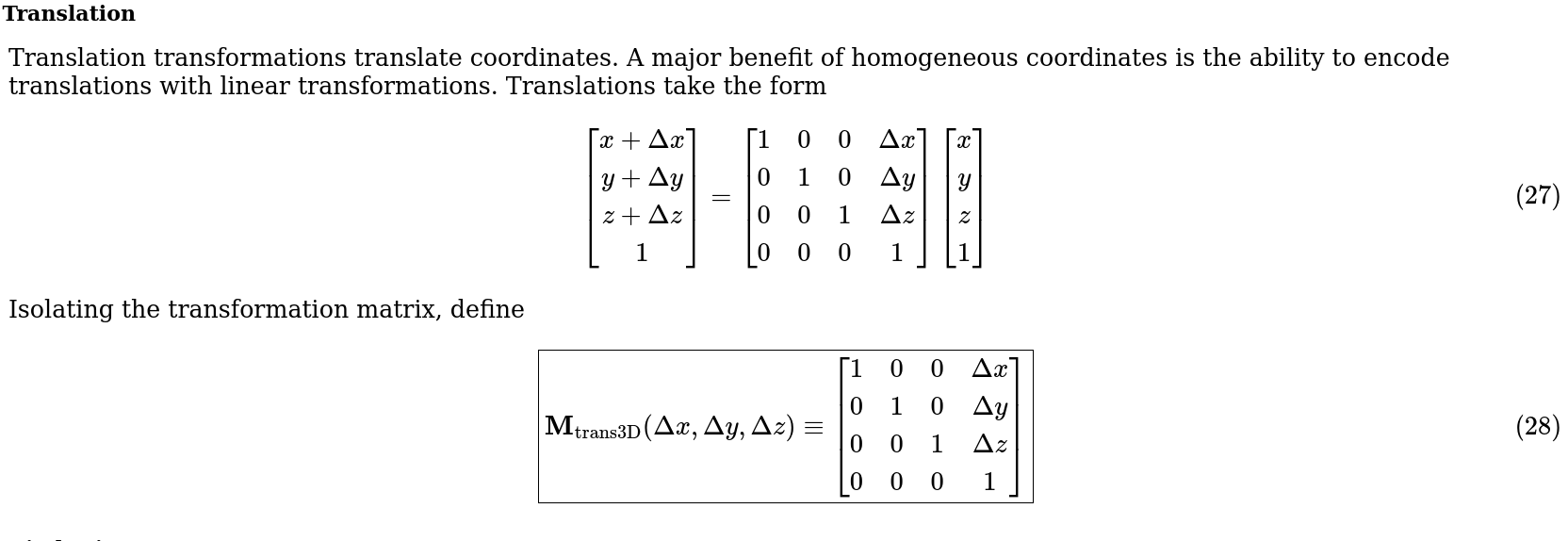 i'd also like to know how to do matrices in general, as of right now my method is simply telling the objects to do some math before they draw, matrices seem a lot more efficient, however ive only ever seen them visualized, not written in code, and most resources *on* that can be really needlessly overbearing with specific context that assumes youve read the entire rest of their sort of ebook, which i do not want to do, as i want most of everything to be things that come as a conclusion on my own excluding very literal descriptions of how to use something.