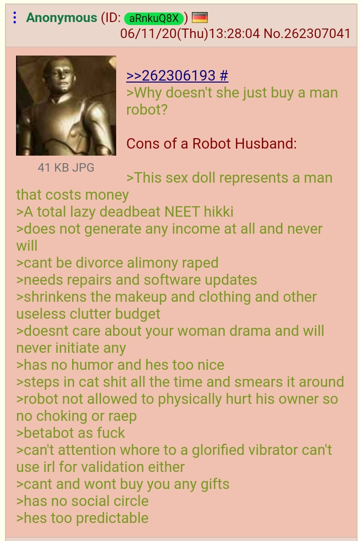 Also, your sorry NEET ass could never afford a robot anyways.